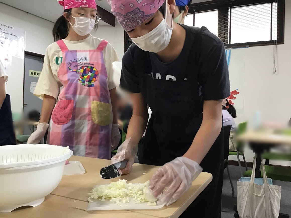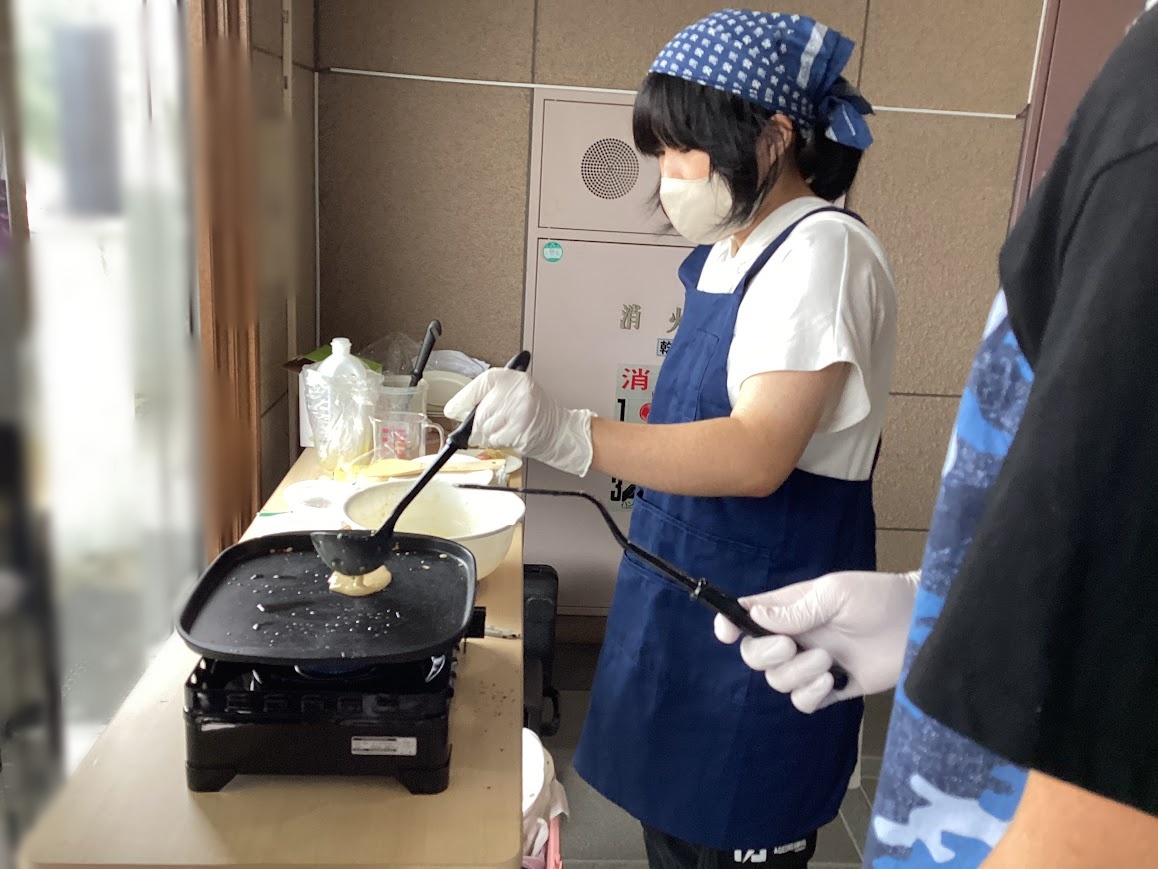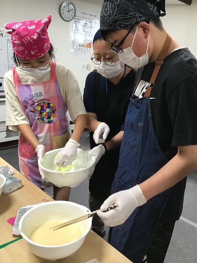 キャベツを切ったり、生地を混ぜたりと、それぞれが自分の役割を果たしながらどんどん焼きを完成させました。