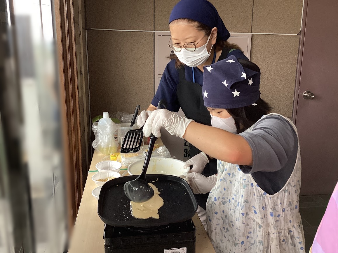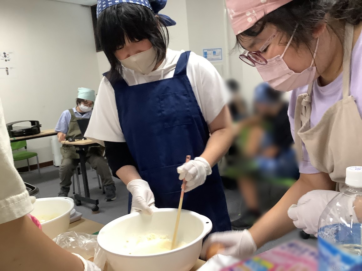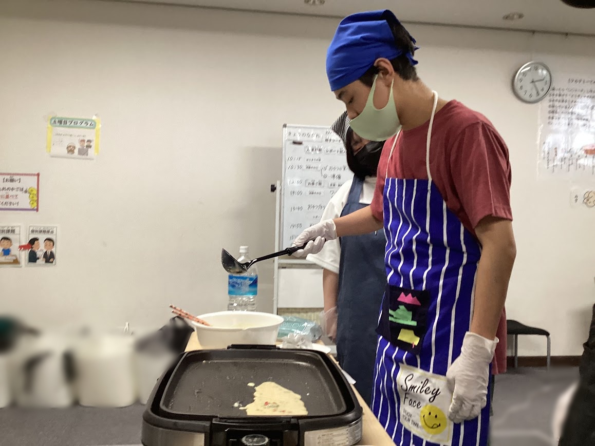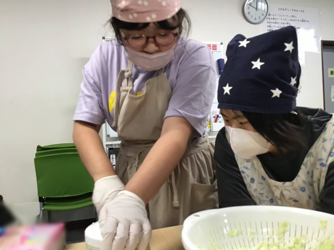 今日は、アカデミー生と一緒に【おやつ作り(どんどん焼き)】を行いました。