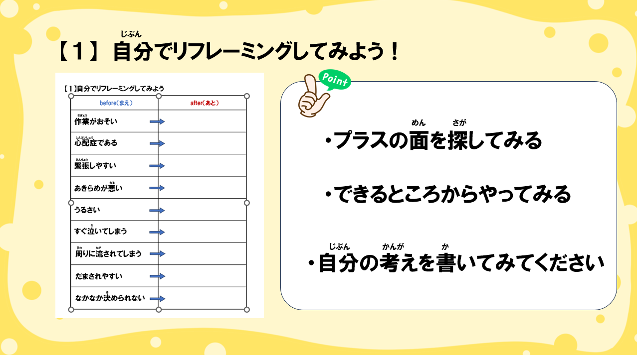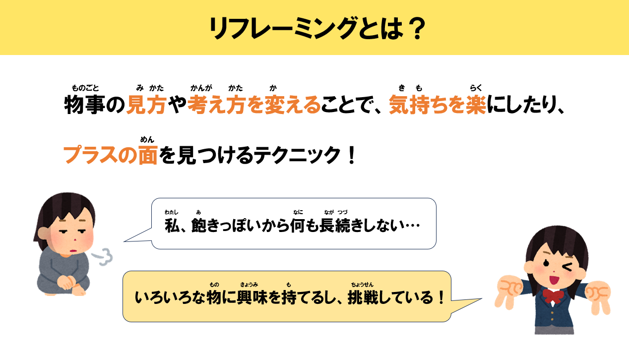 リフレーミングの説明をしてから、実際に取り組んでいただきました✍