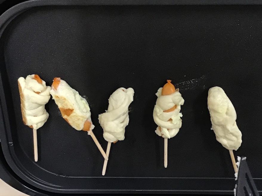 ホットケーキミックス捏ねて、ミイラの包帯のように伸ばして巻き付けます!