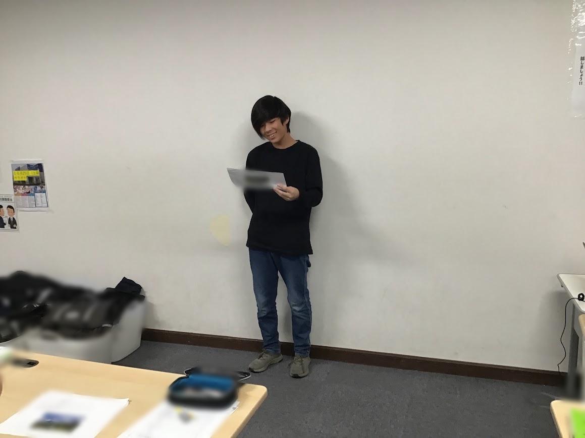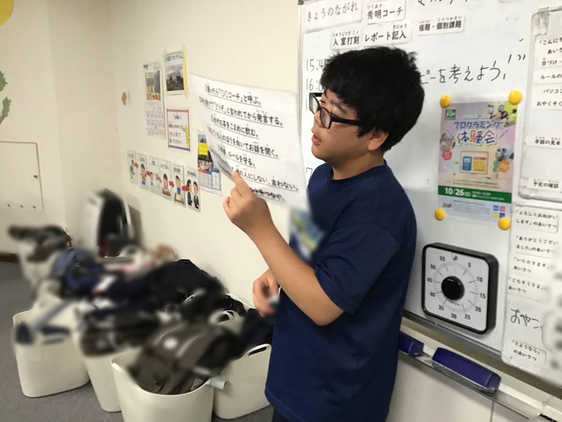 「始まりの会」の発表! ルールなどをホワイトボード前で発表してもらいます。