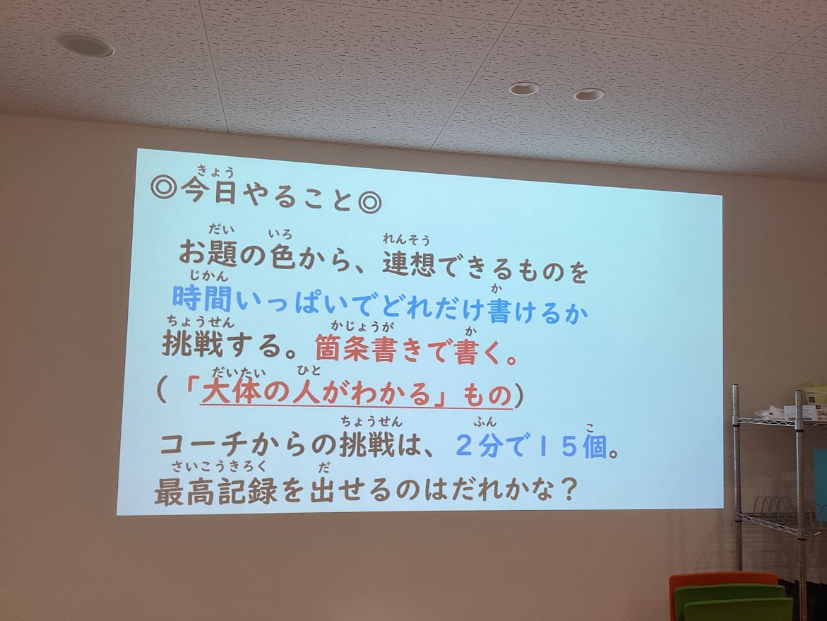 1つの色から連想できる、「大体の人が知っていそうなもの」の名前をたくさん考えて書く活動を行いました。