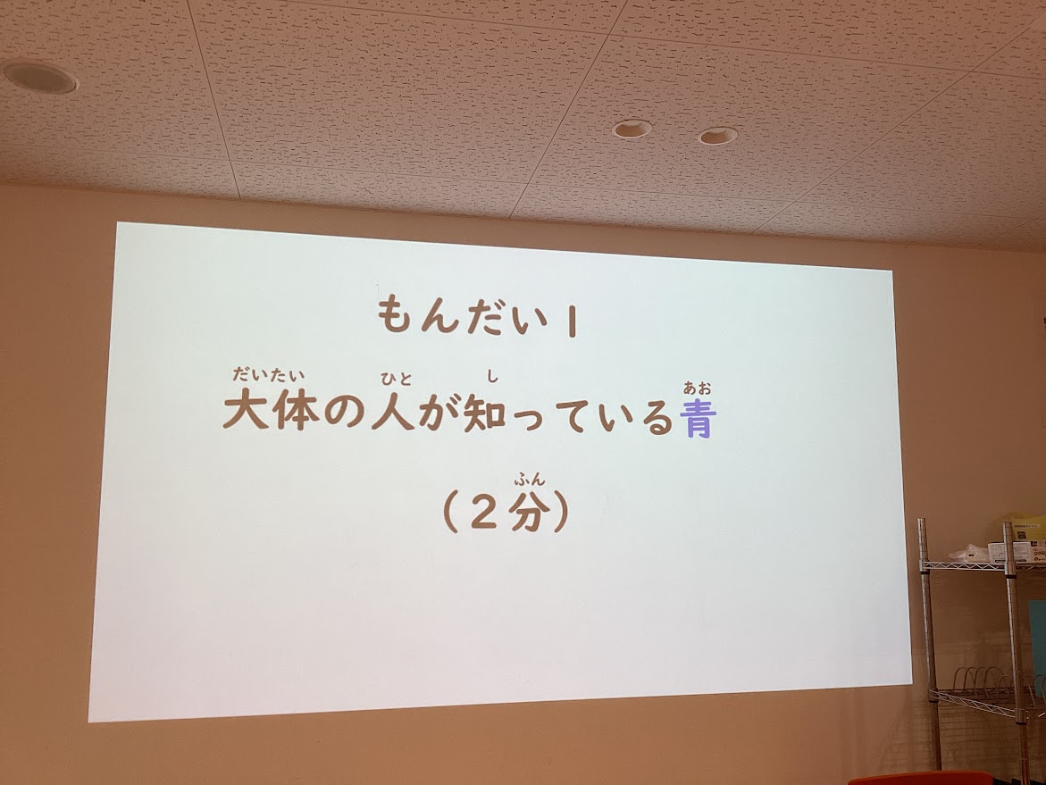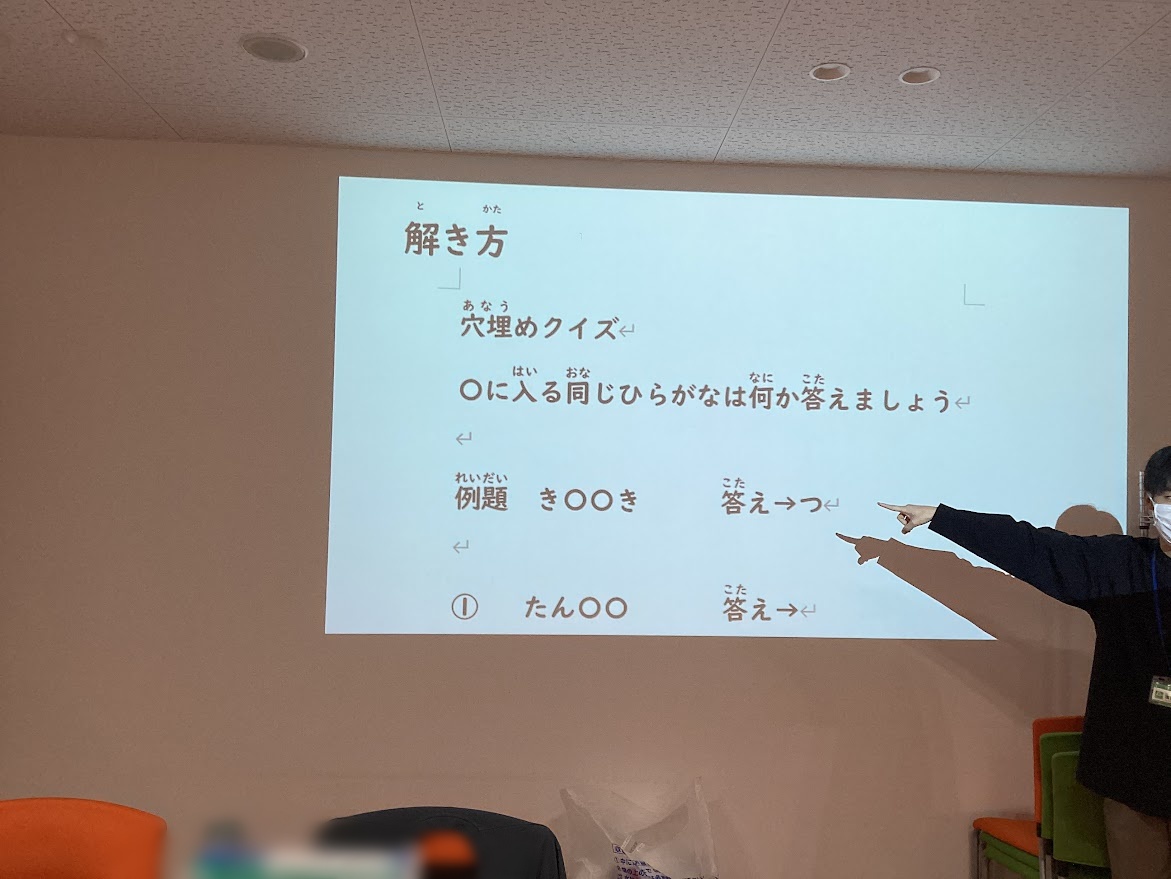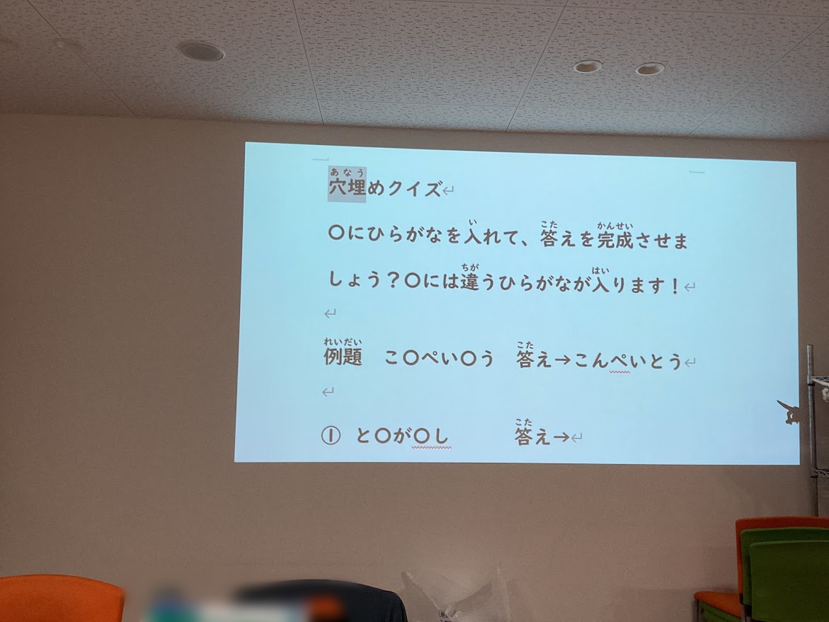「き〇〇き→きつつき」のような〇に入る同じひらがなを当てるクイズに挑戦しました。