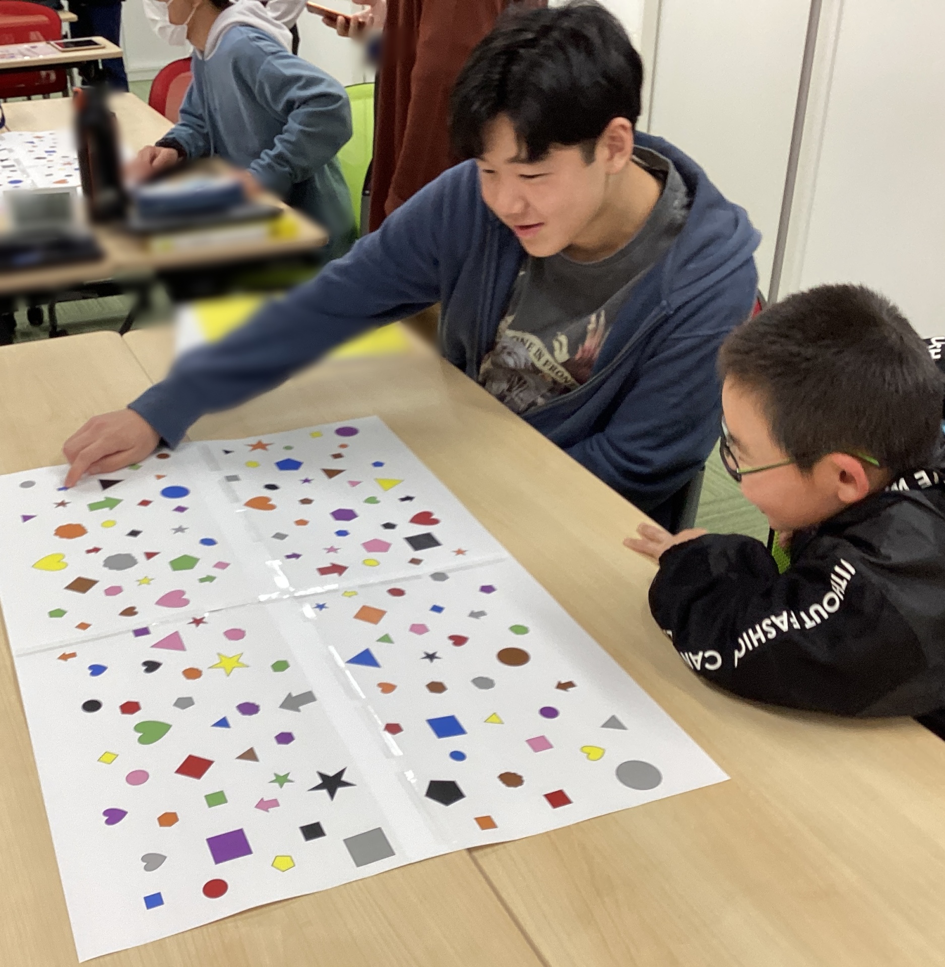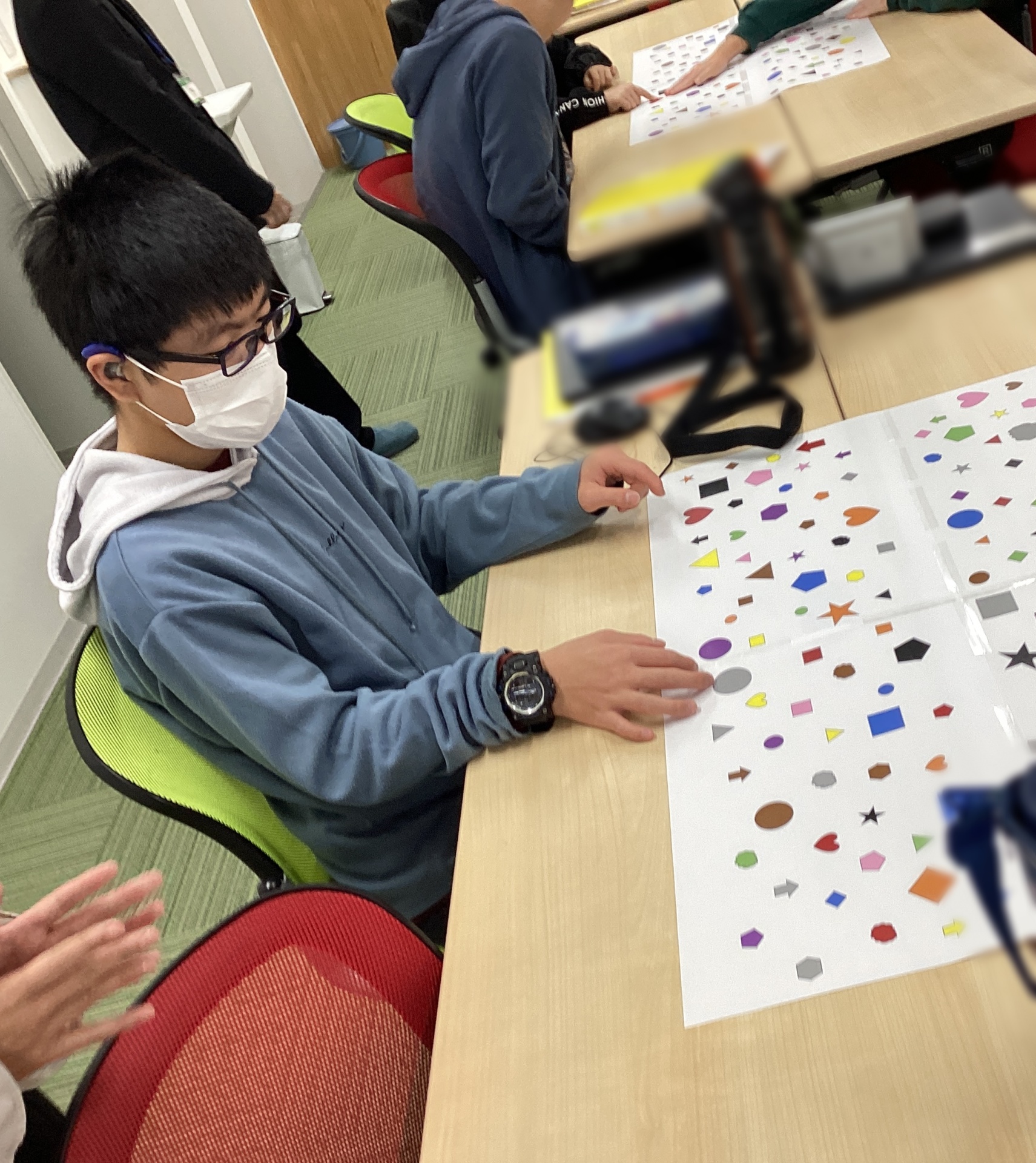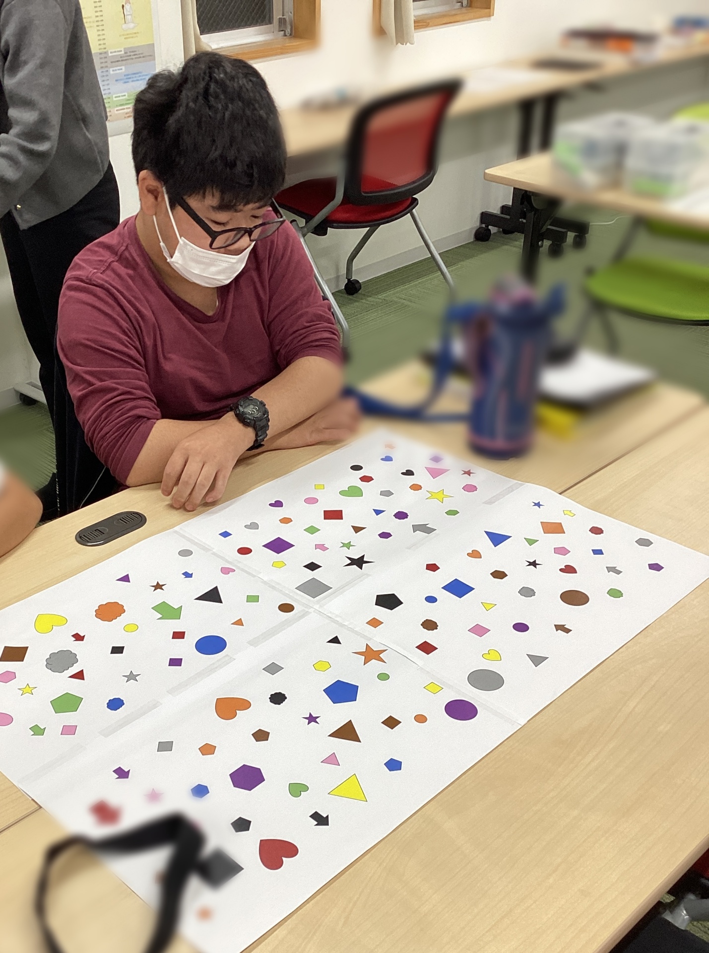 グループに大きなプリントを配り、コーチが指定した形・色・大きさの図形を探していただきました。