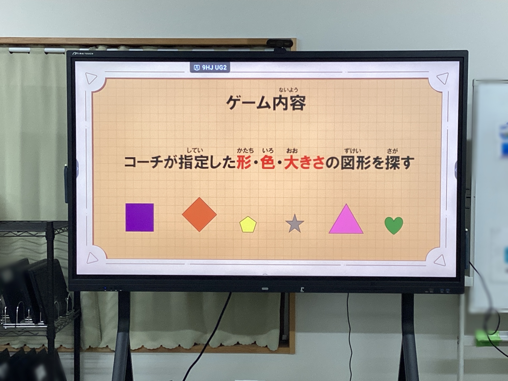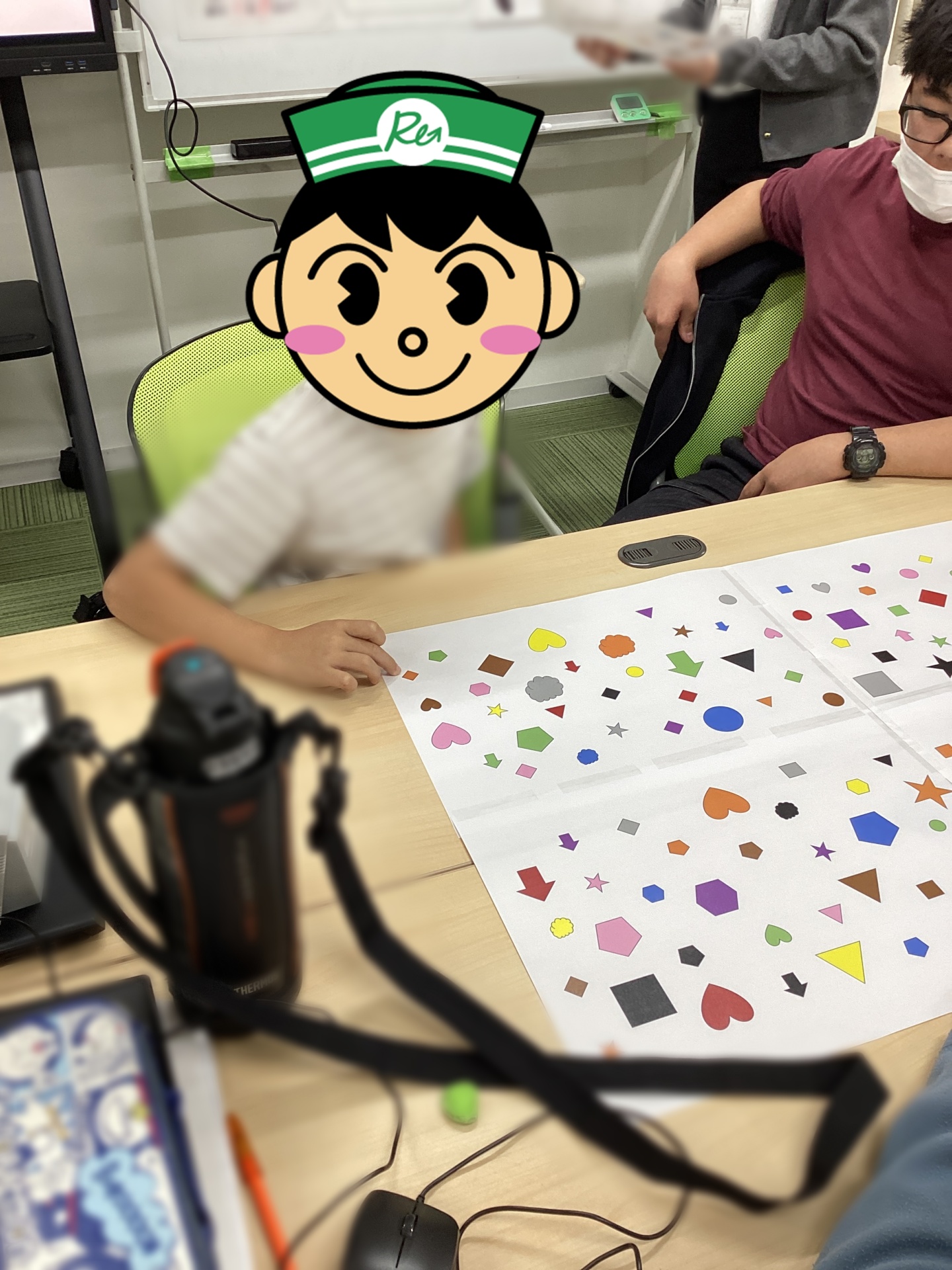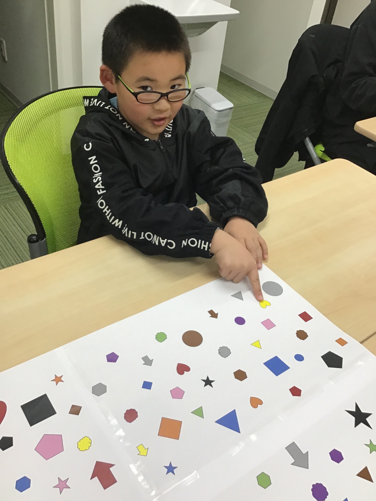 グループに大きなプリントを配り、コーチが指定した形・色・大きさの図形を探していただきました。