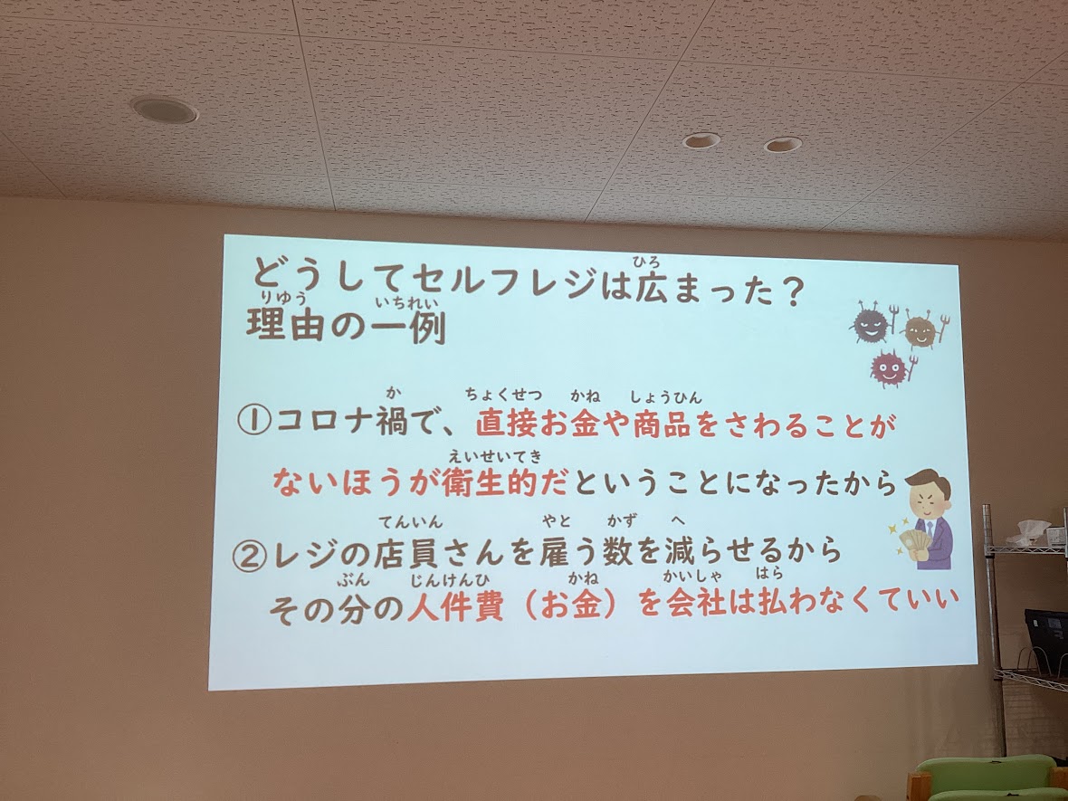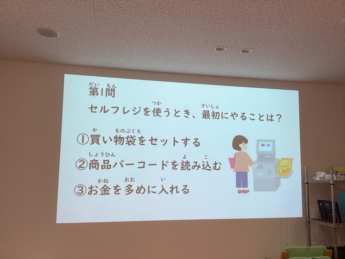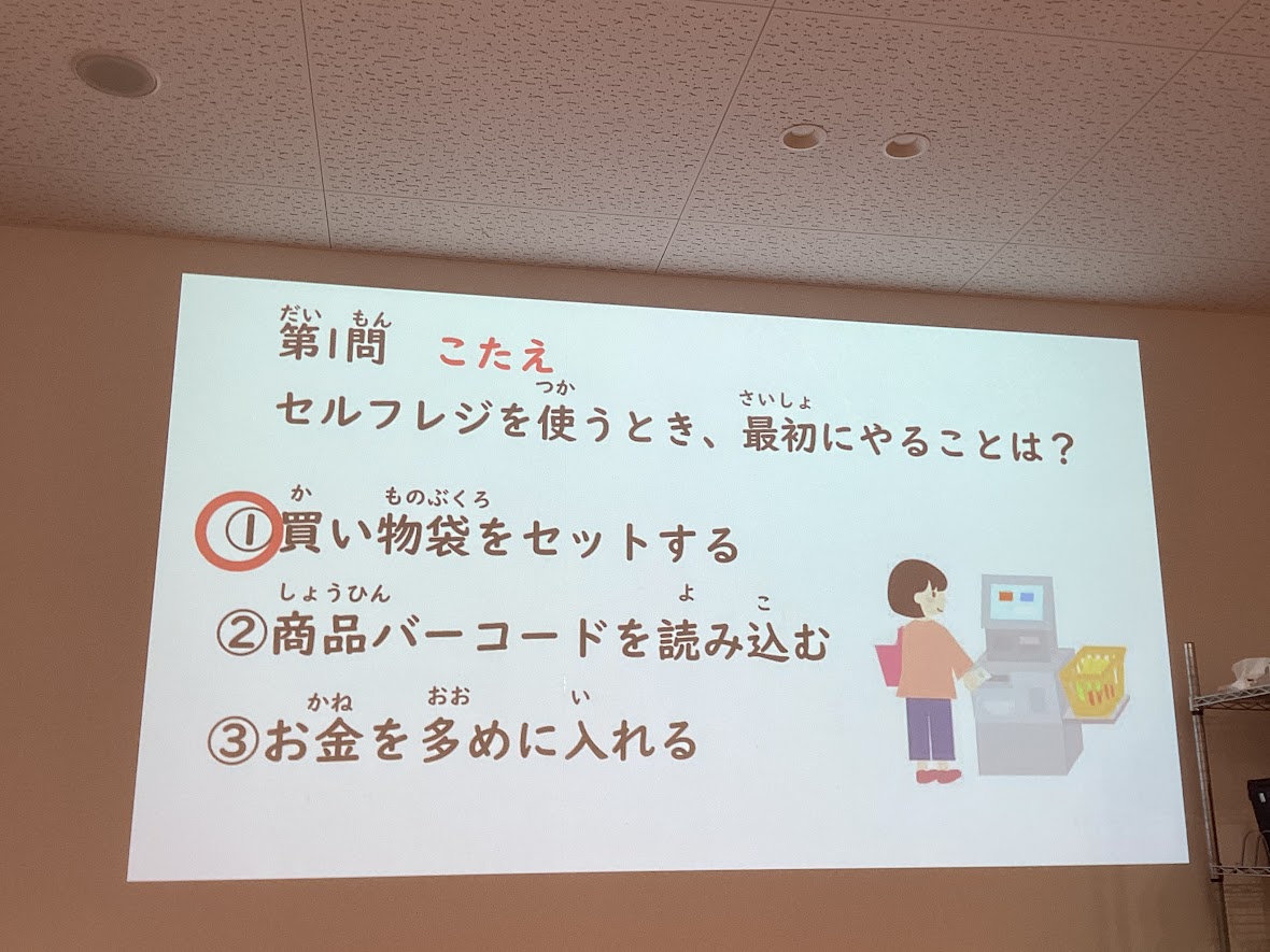 セルフレジの使い方について説明を聞き、クイズを通して学んだあとに