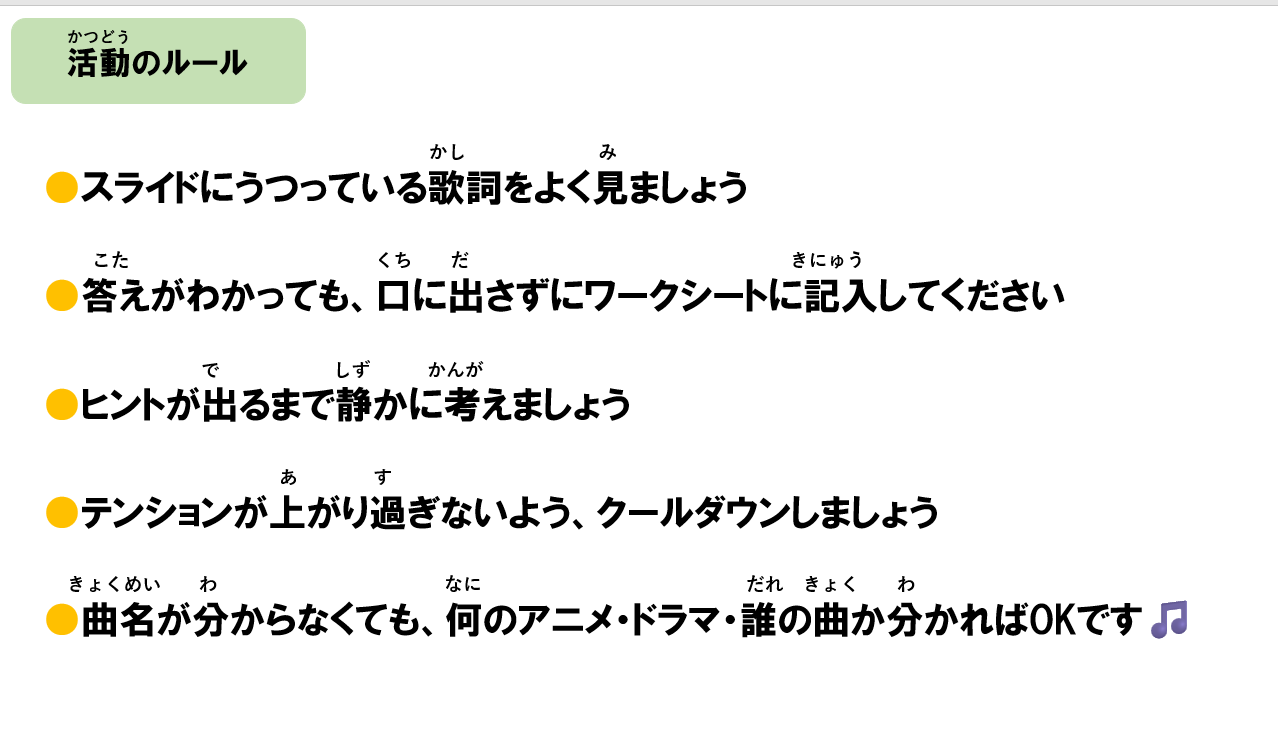 有名なアニメソングや、最近のヒットソングの歌詞をスライドに表示し、「曲名」「誰の曲か」などを当てていただきました🎵