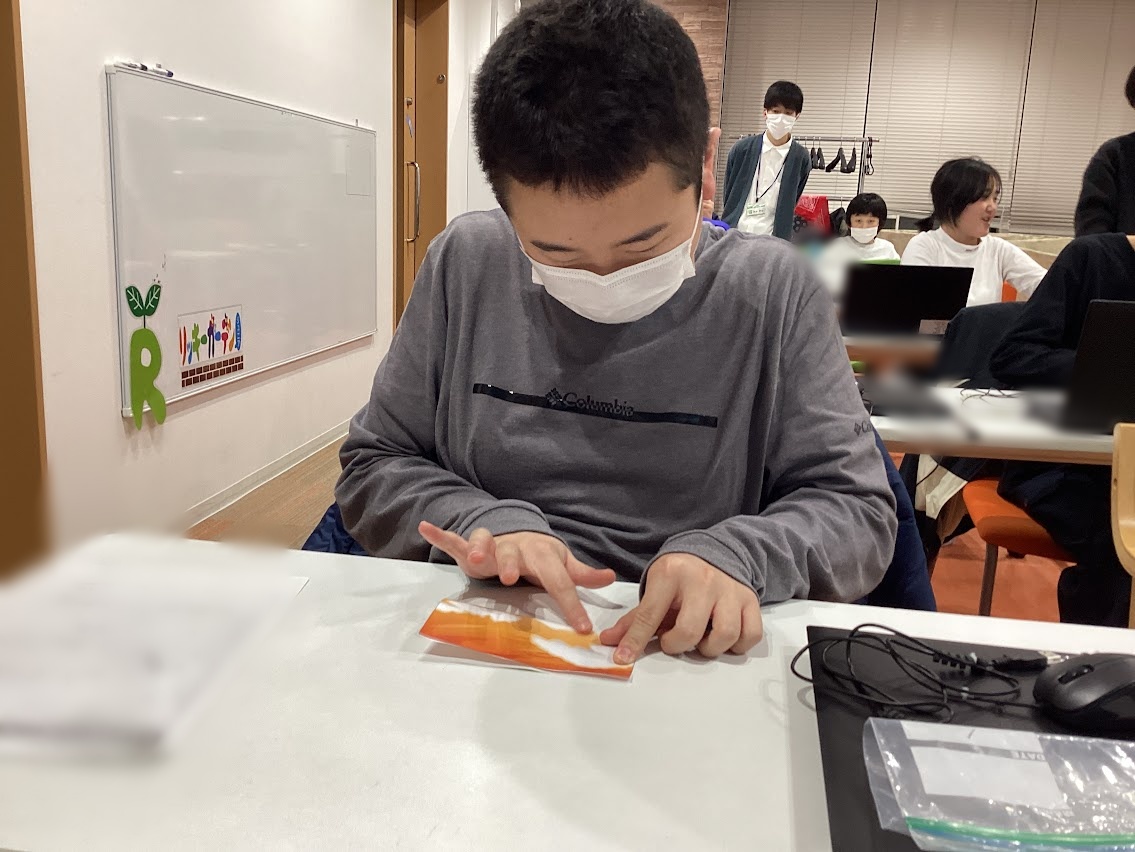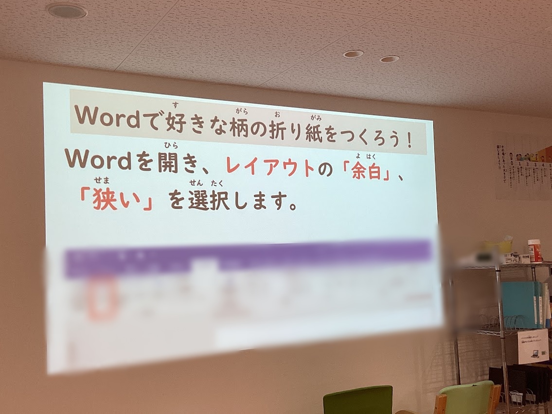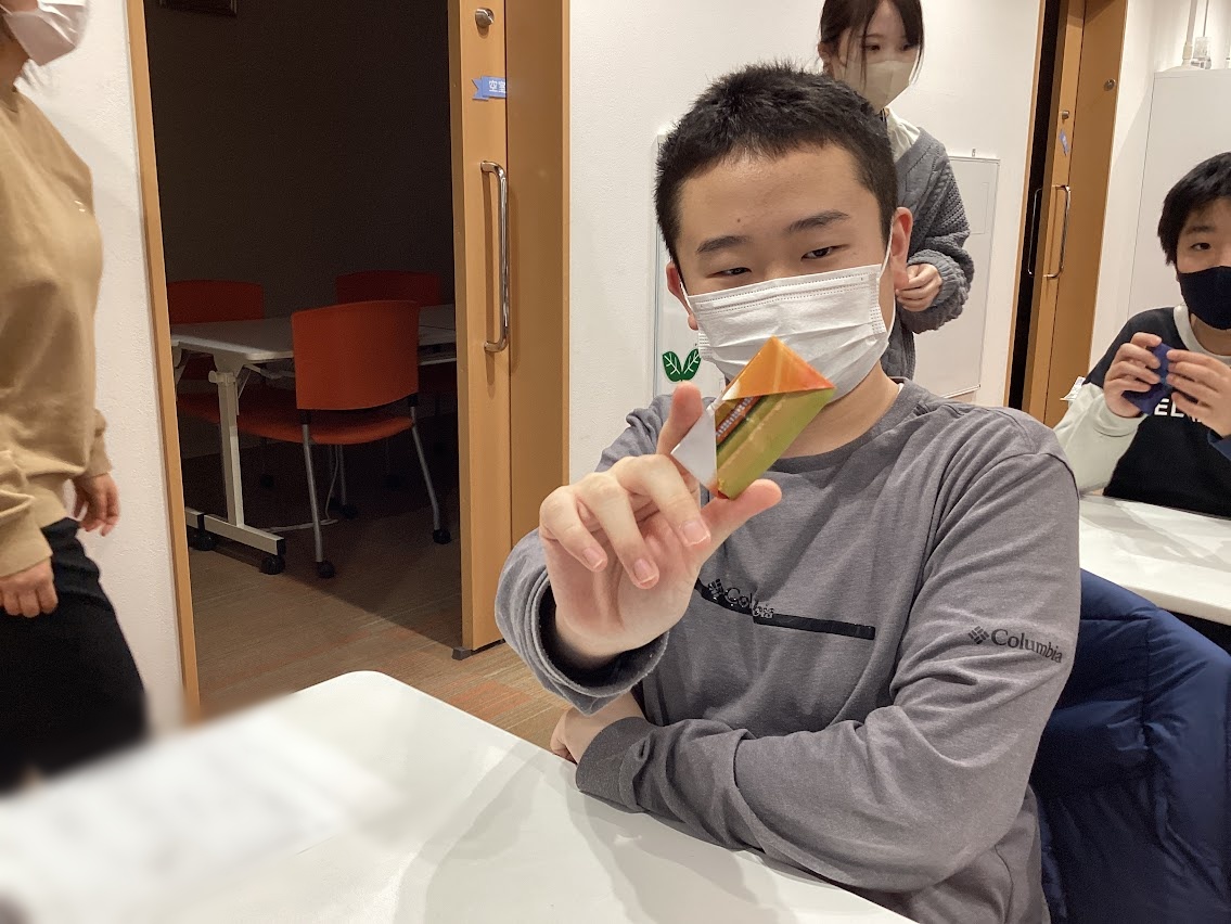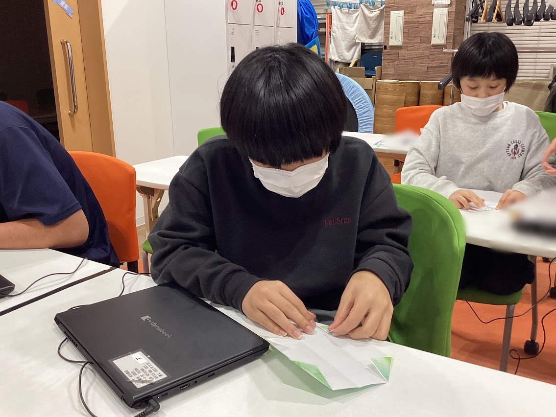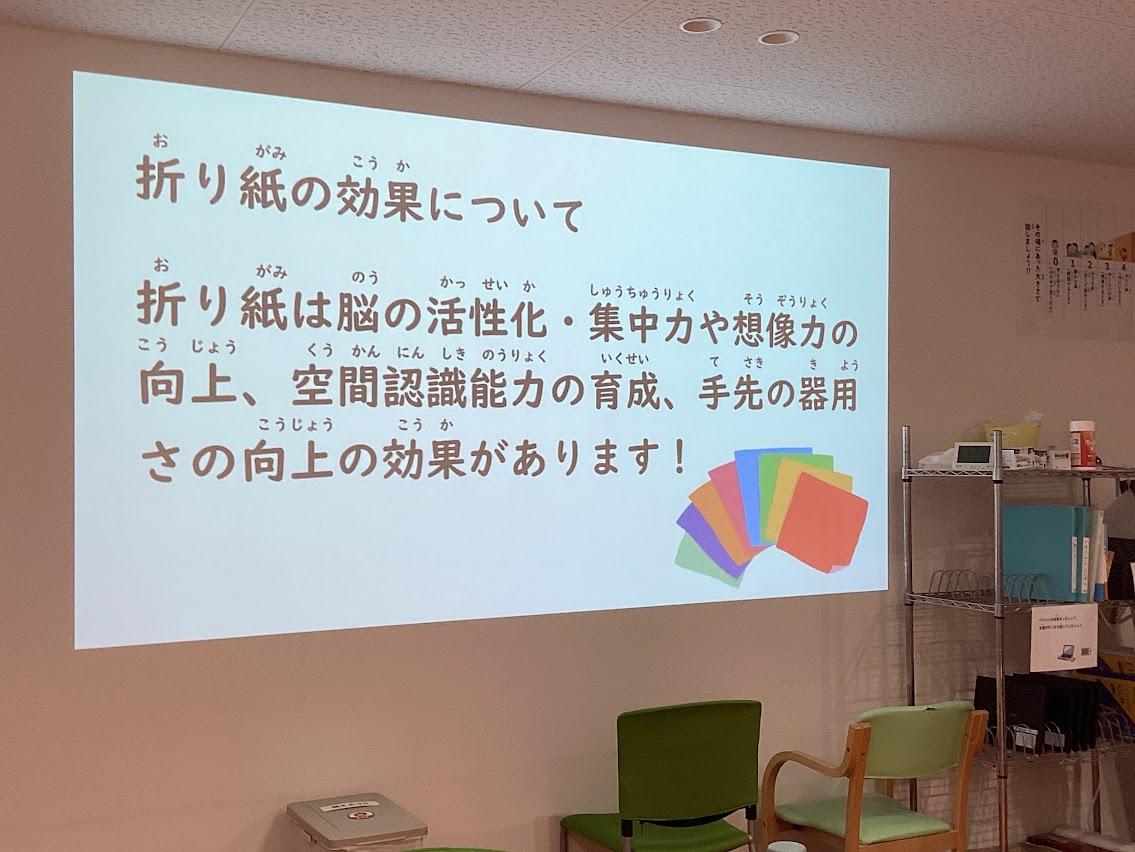その後、作った折り紙を使って、全体でメモスタンドの折り方を確認しながら一緒に折って