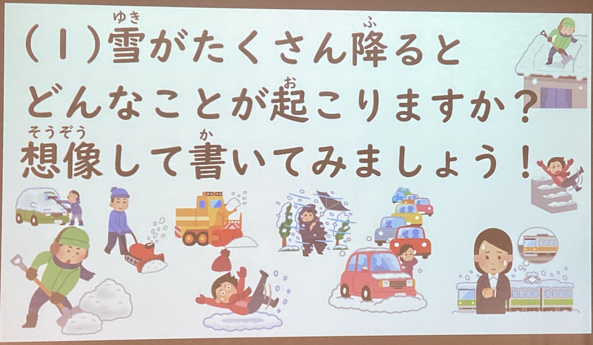 まずは雪がたくさん降るとどんなことが起こるかを災害や事故、面倒事などの目線で考え、答えました。