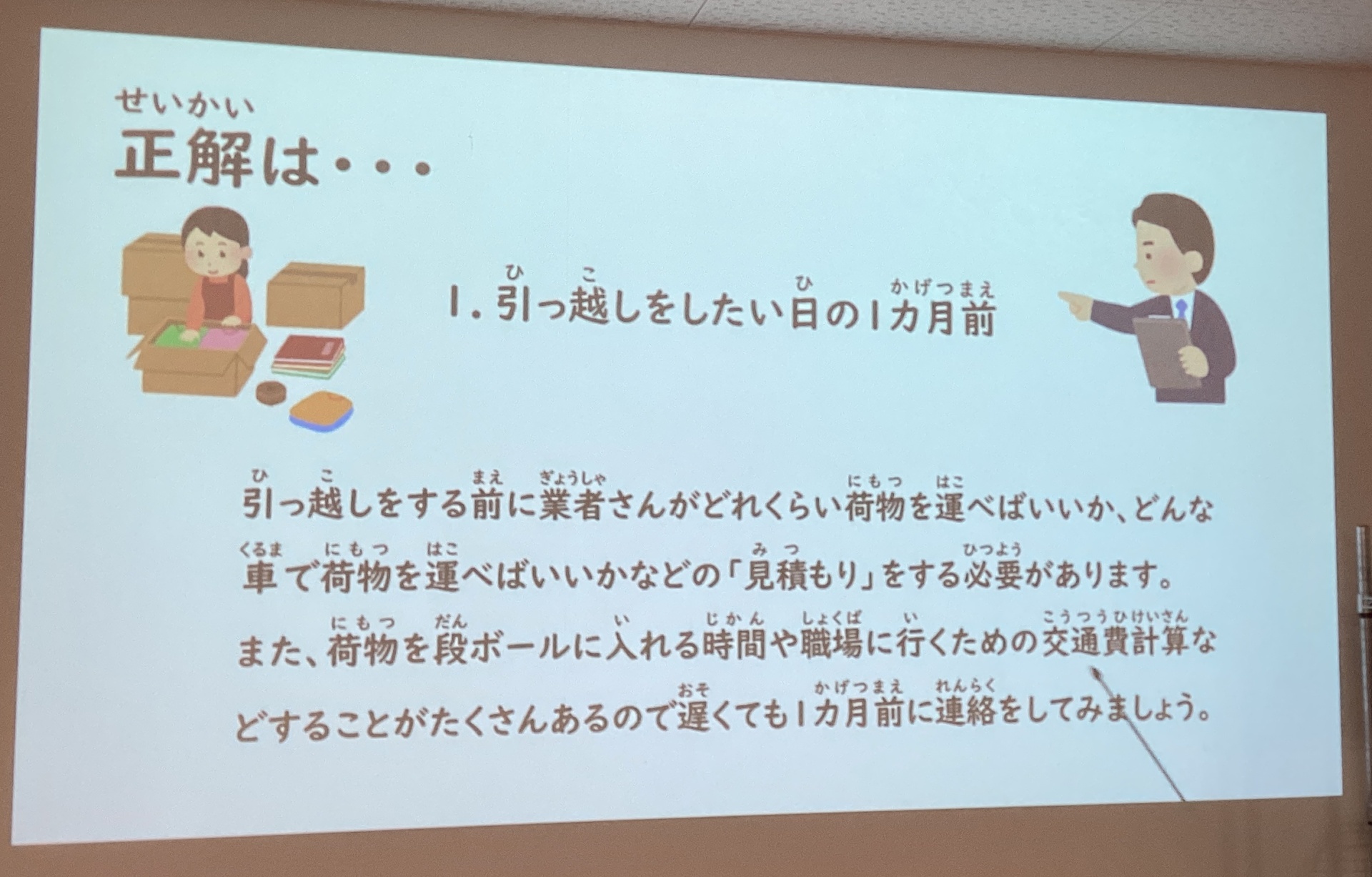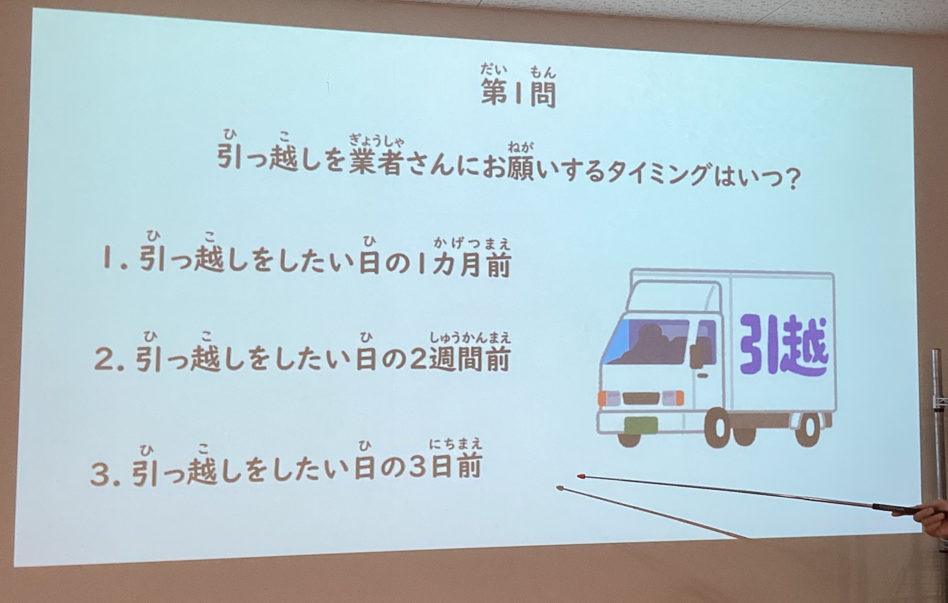 今日は「クイズで引っ越しの知識を勉強」「家具家電について調べる」の二項目を行いました。