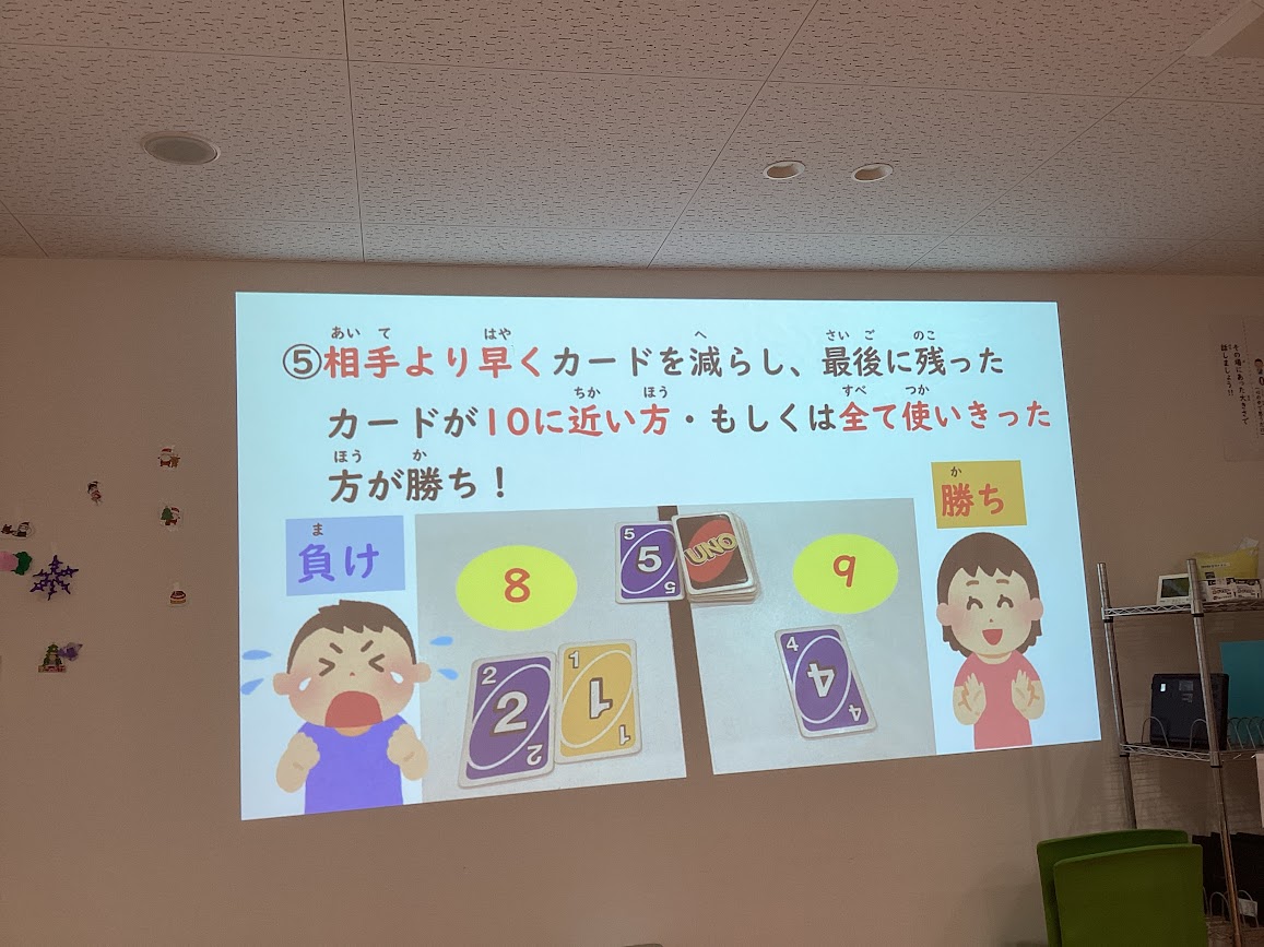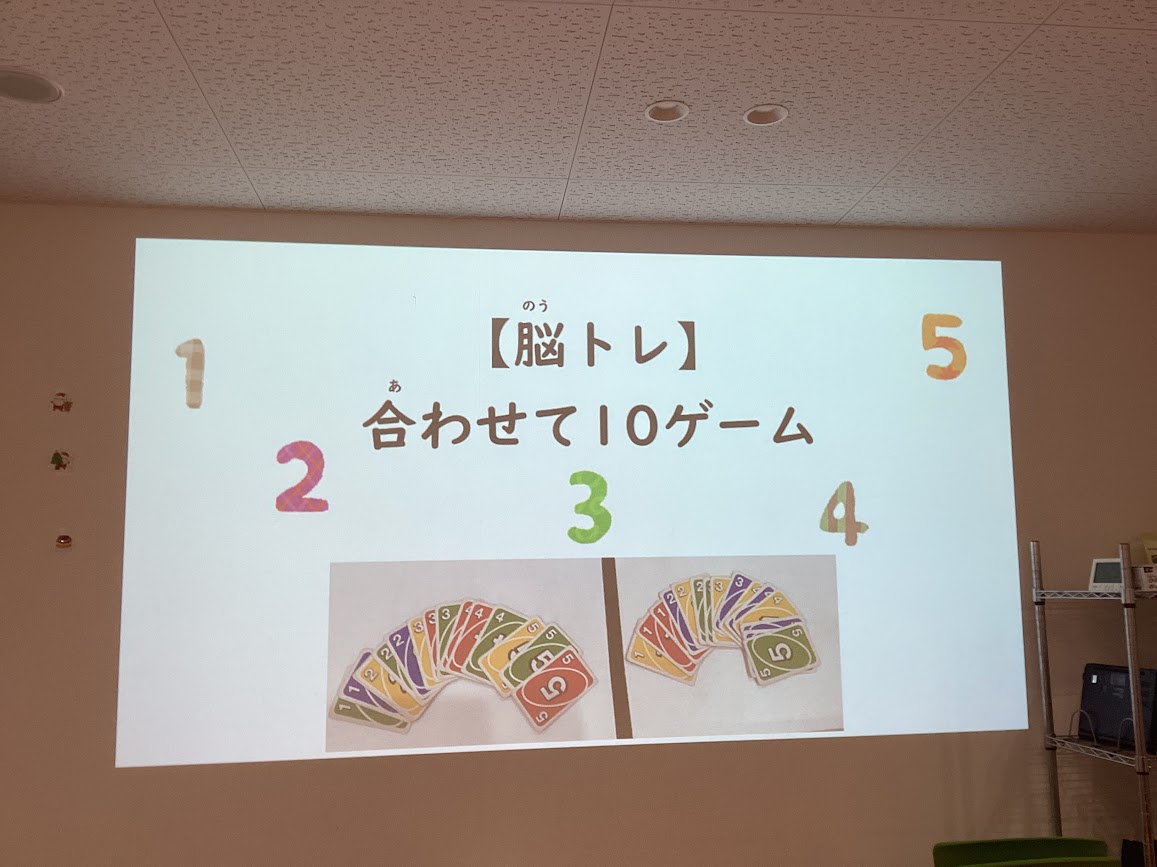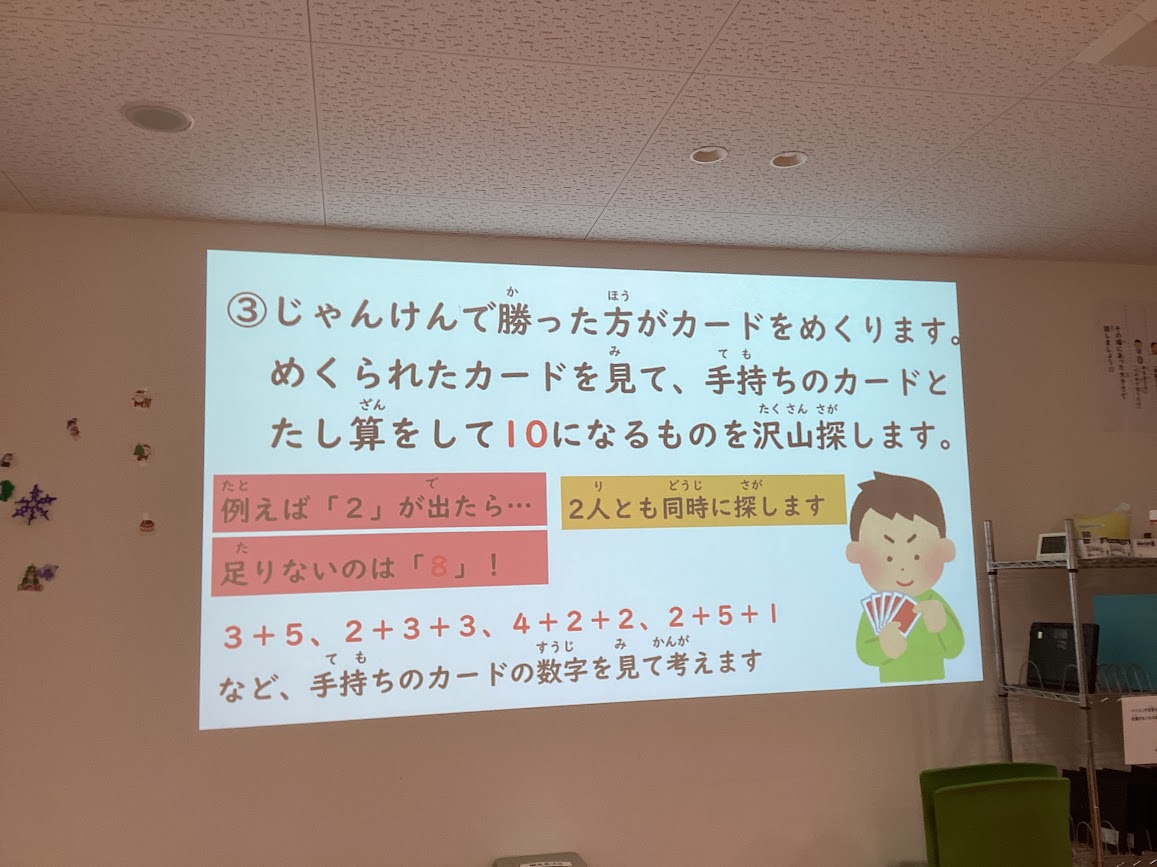 数字の書かれたカードを足し算して「10」の数字を見つけていくゲームを行いました。