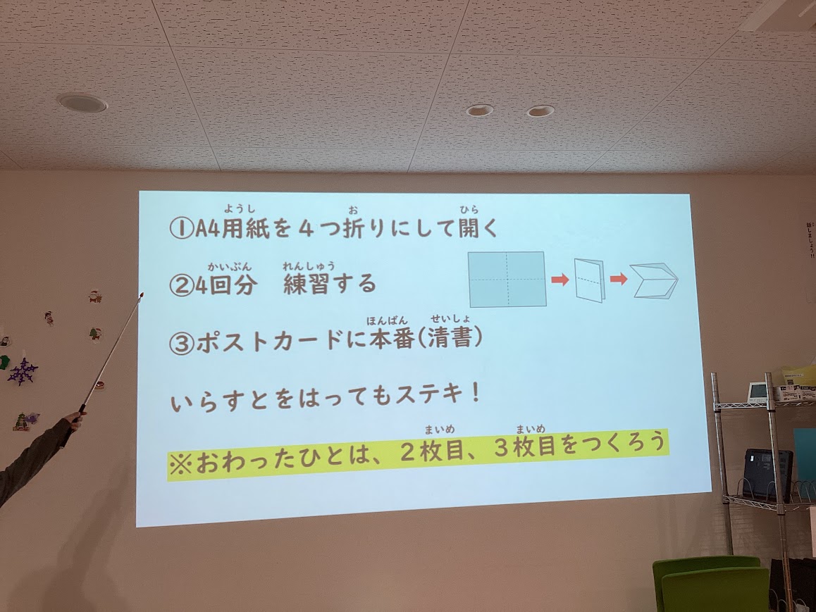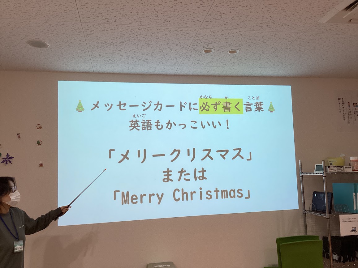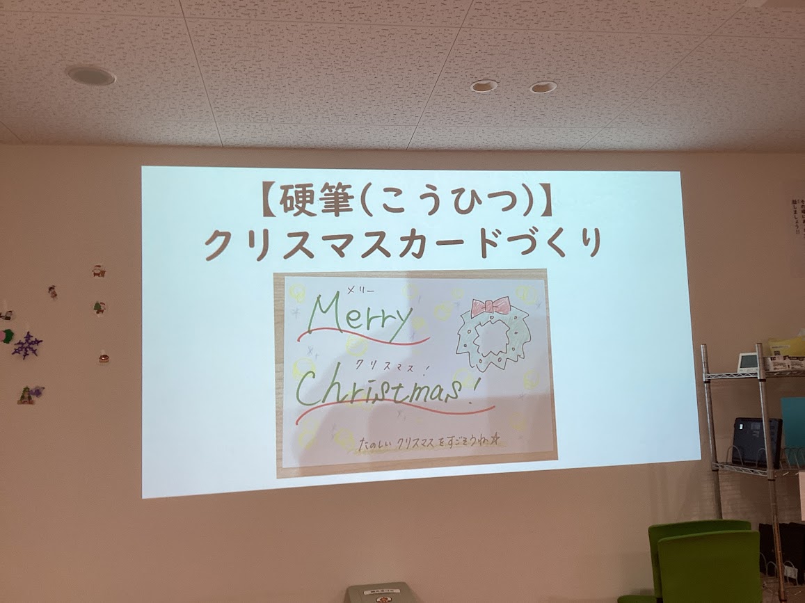 ポストカードに「メリークリスマス」の文字を丁寧に書き、クリスマスカードを作成しました。