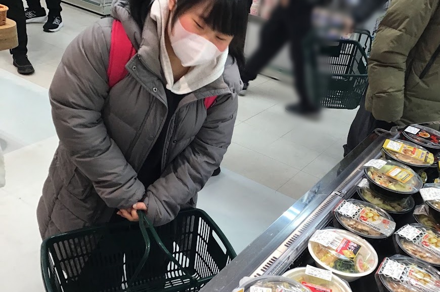 店内に並ぶたくさんのお弁当やお惣菜を前に、「どれにしようかな」と自然に笑顔がこぼれ、選ぶ時間をとても楽しまれている様子が印象的でした。