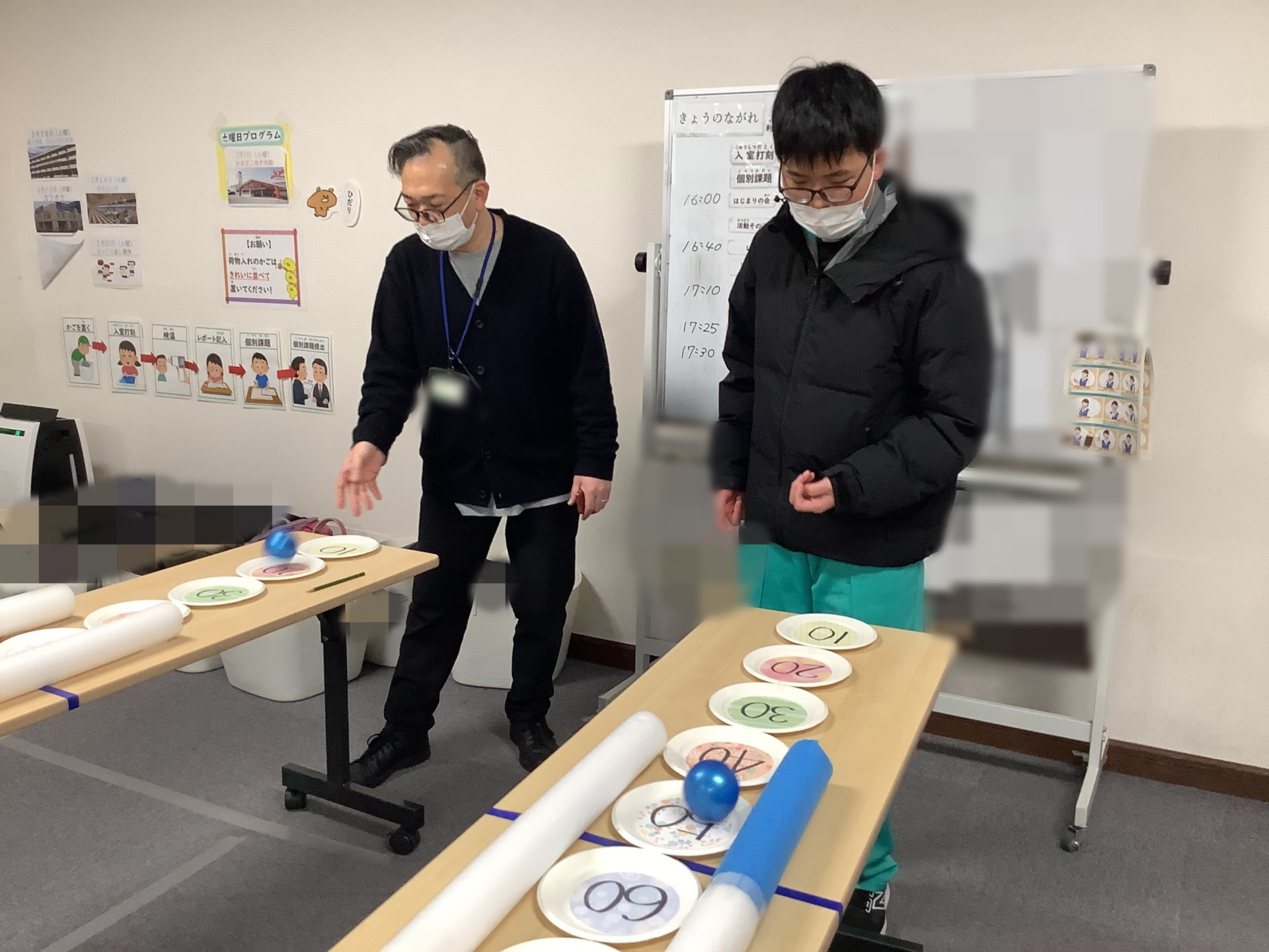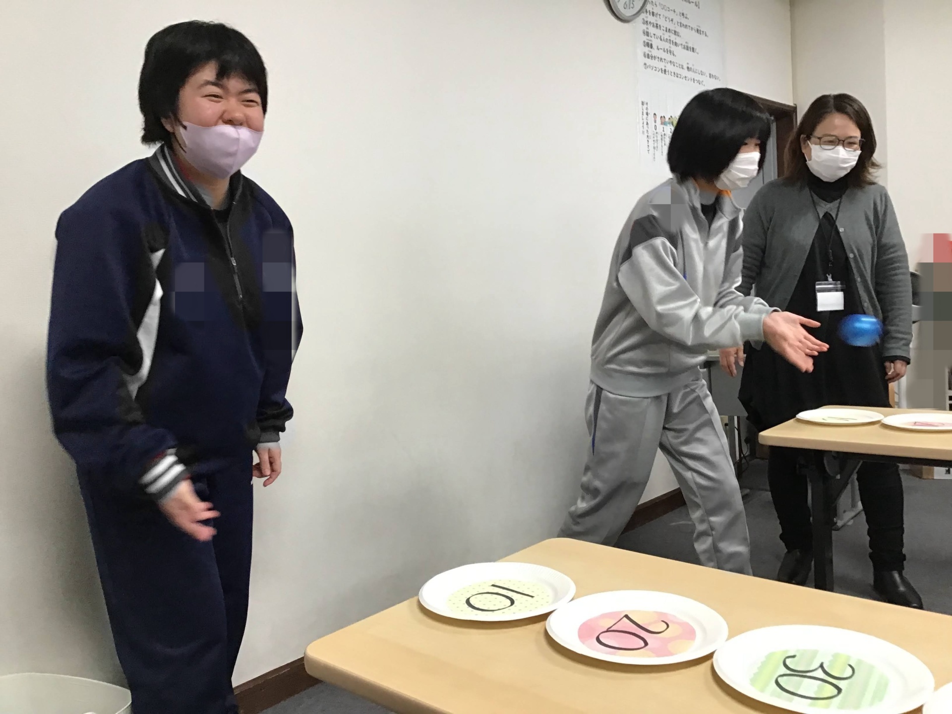 並んだお皿の点数を狙いながらボールを転がし、高得点を目指す集中力と体の動かし方(力加減)を知る運動です。