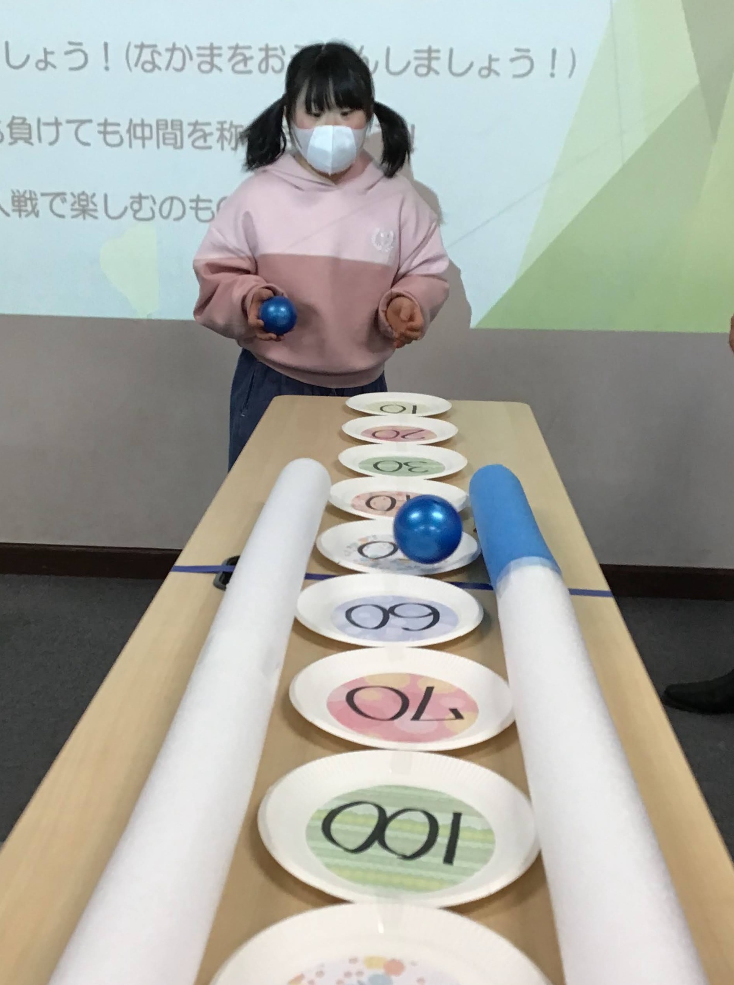よ~く狙いを定めて力加減をしながらボールを転がします🥎