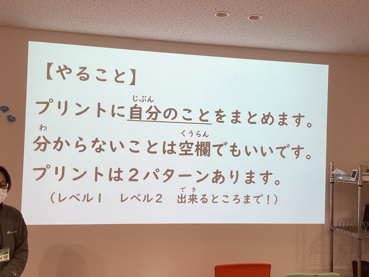 プリントに自分のプロフィールや好きなものを書くことで、自分自身を見つめ直す時間を作りました。