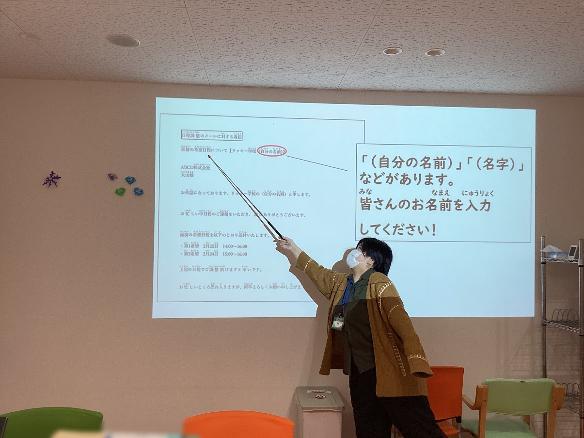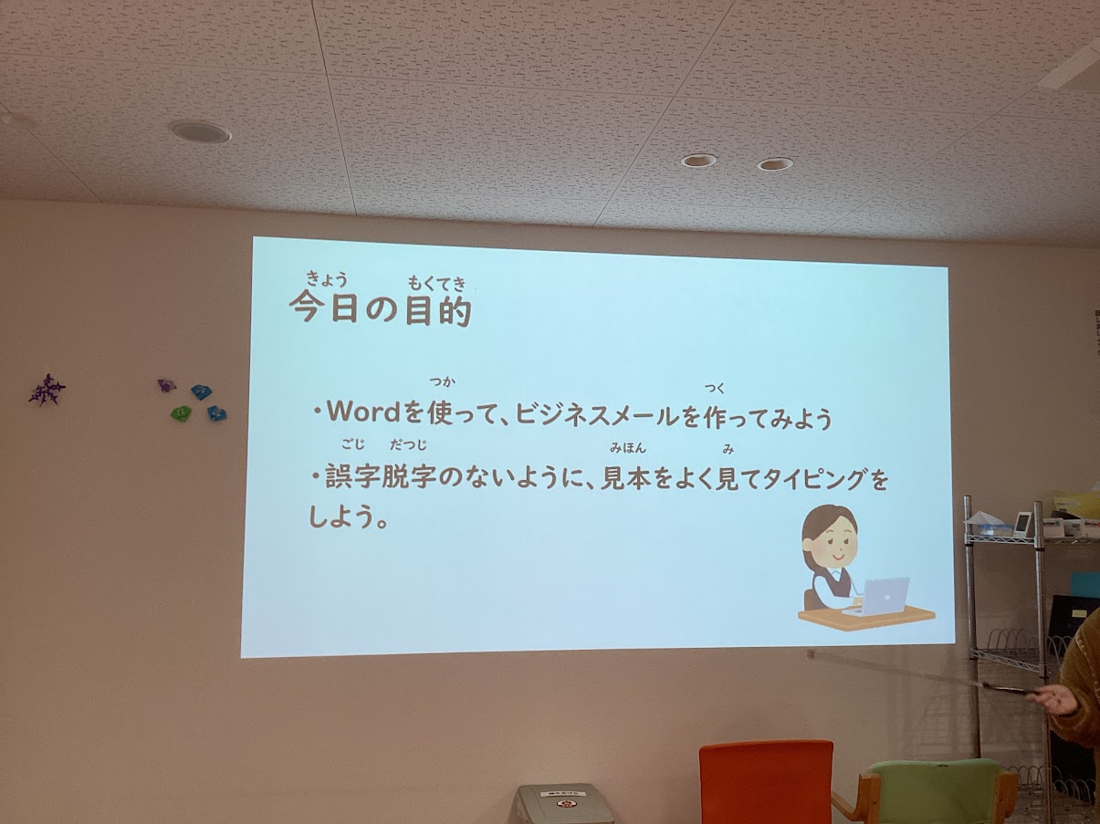 例文を見ながらWordにタイピングをしていただき、ビジネスメールを体験していただきました。