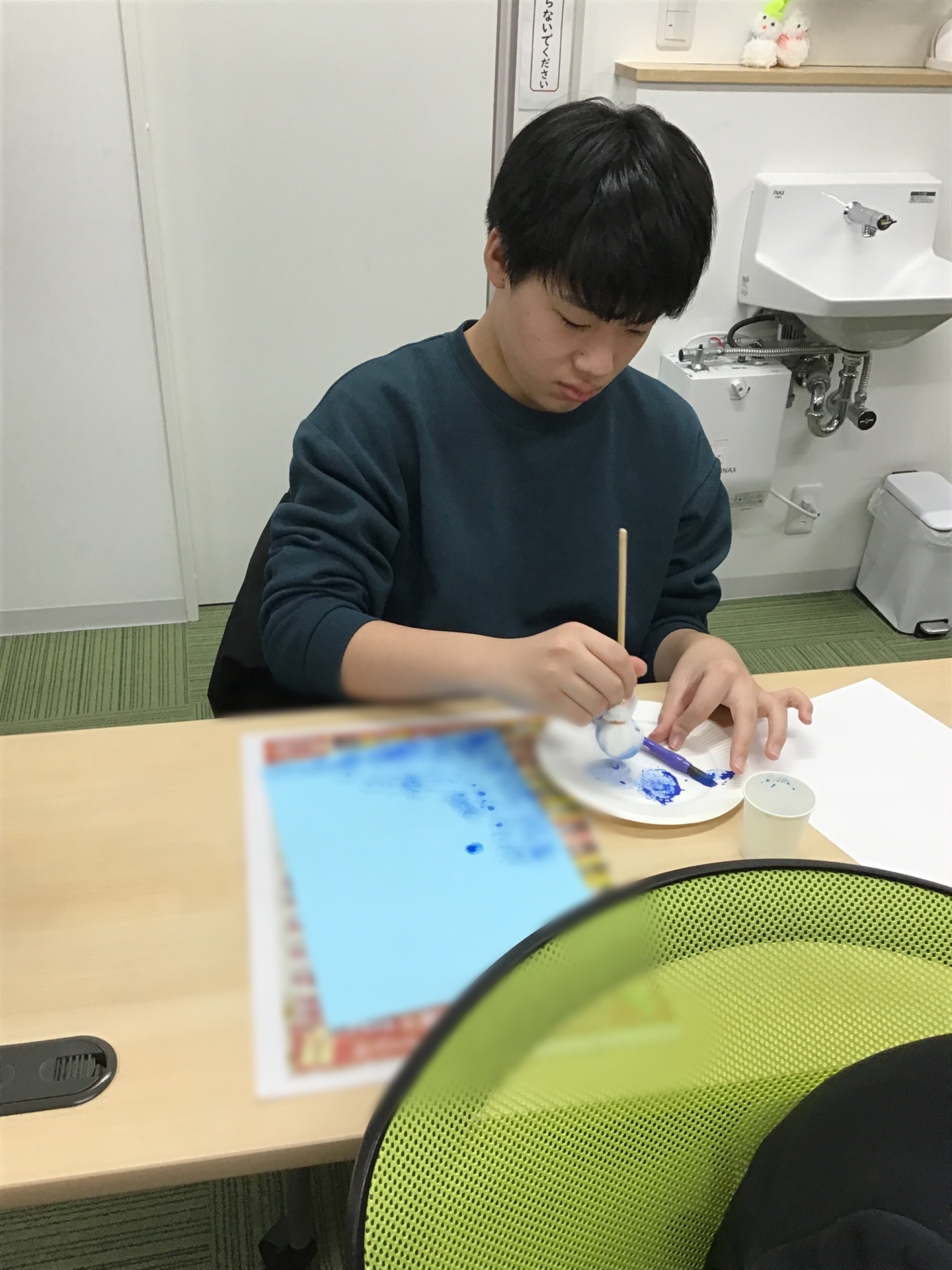 ▼画用紙・絵の具・タンポなどを使用して、アート作り開始!