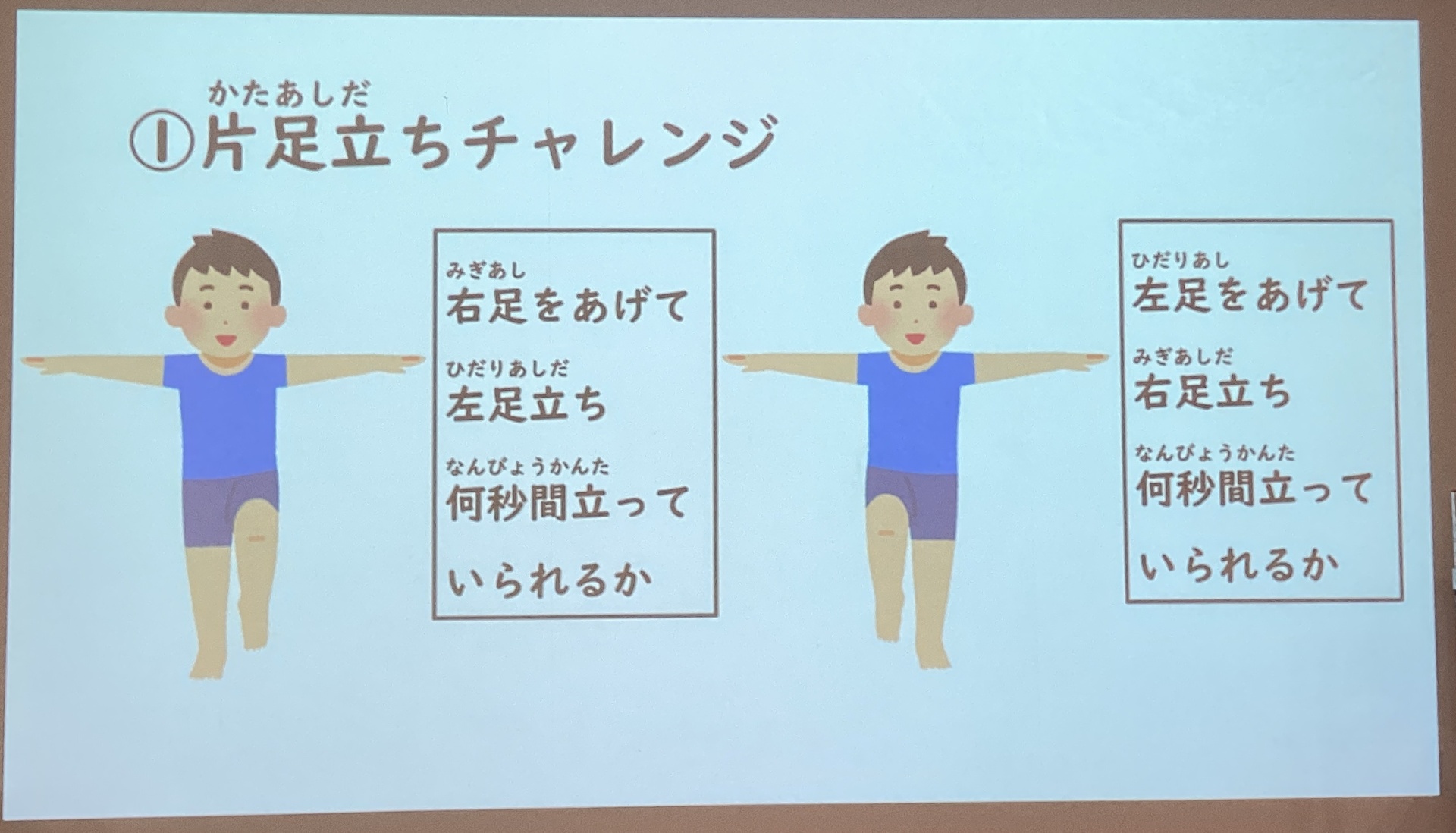 ①片足立ち②片足目つむり立ち③片足新聞乗せ立ち④片足新聞乗せ目つむり立ちの4種目行いました。
