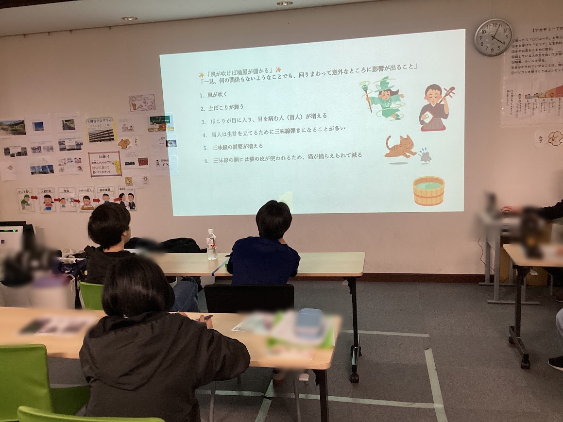 本日は【風が吹けばゲーム2】を実施しました。「風が吹けば桶屋が儲かる」の物語の仕組み(原因と結果の連鎖)を使った、オリジナルのリレーゲームです。この活動により物事の因果関係、発想力・想像力、表現力を豊かにする効果を期待できます。今回は2チームに分かれたグループワーク形式で行い、チームごとに意見を出し合いながら最終的な結論を導き出してもらいました。