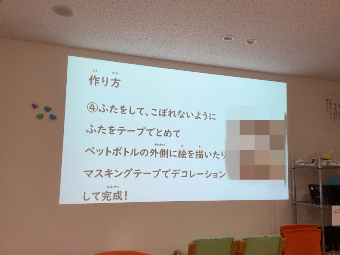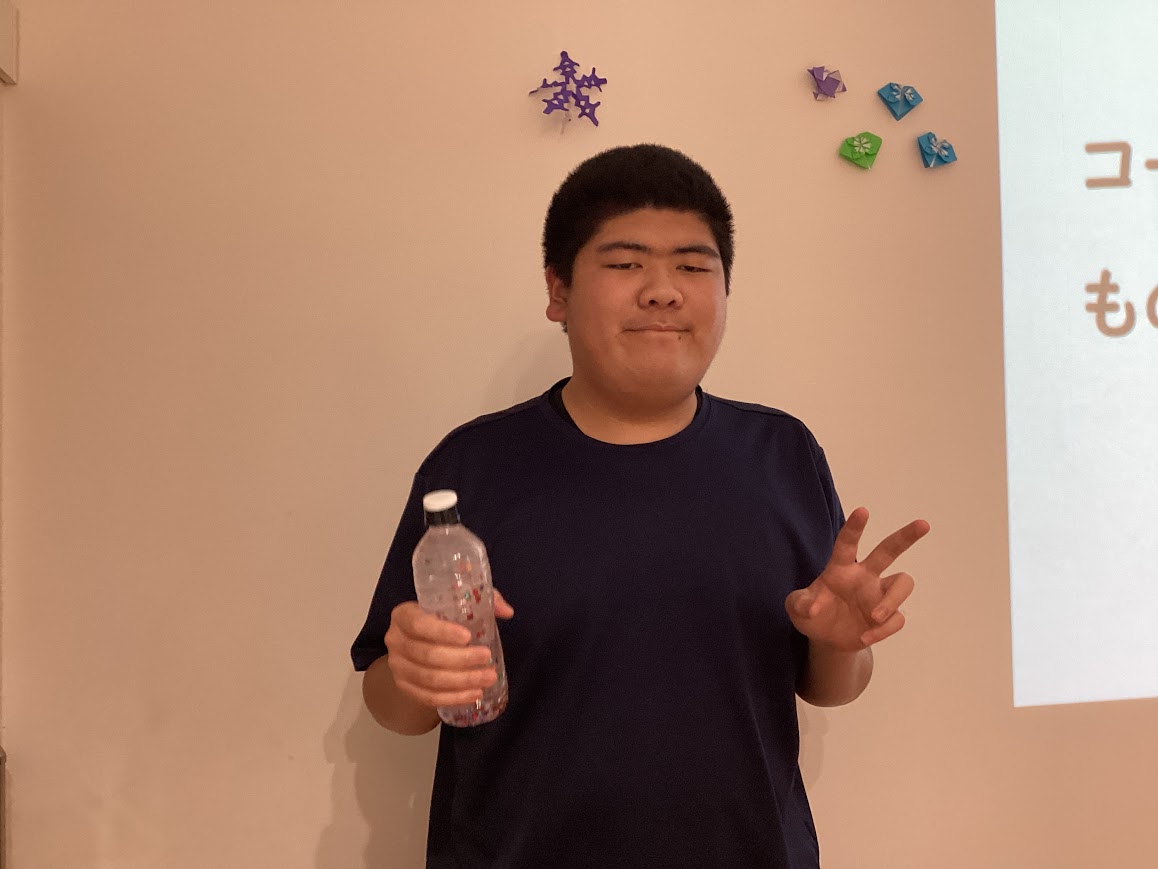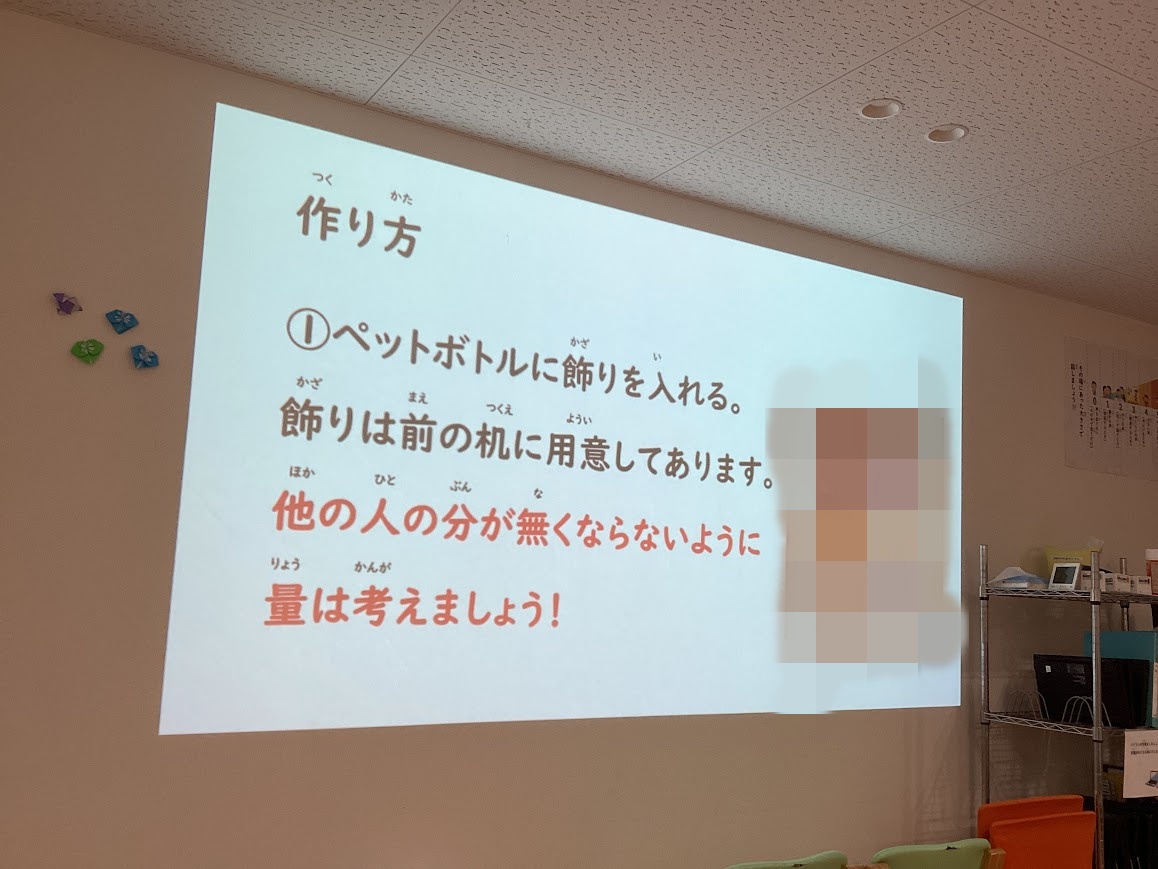 「スパンコール、糸、モール、クリアファイルの飾り、ストロー」などの飾りをペットボトルに入れた後に