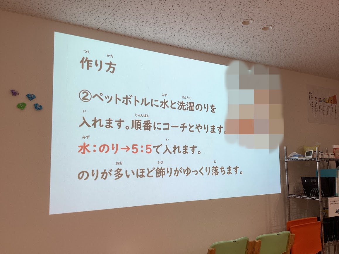 水と洗濯のりを入れて混ぜ、オリジナルのスノードームを作りました。