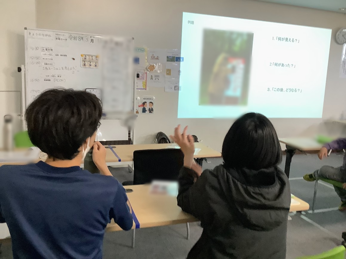 一枚の絵から「何が起きているのか」「登場人物は何を考えているのか」を想像する活動です。言語能力や思考力を鍛えるトレーニングです。