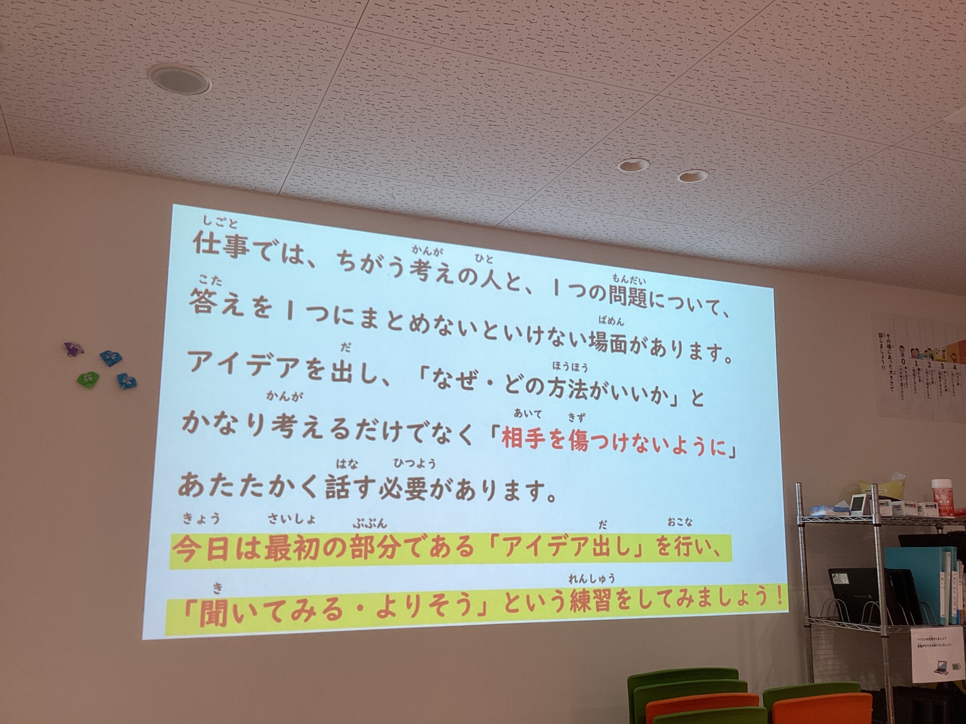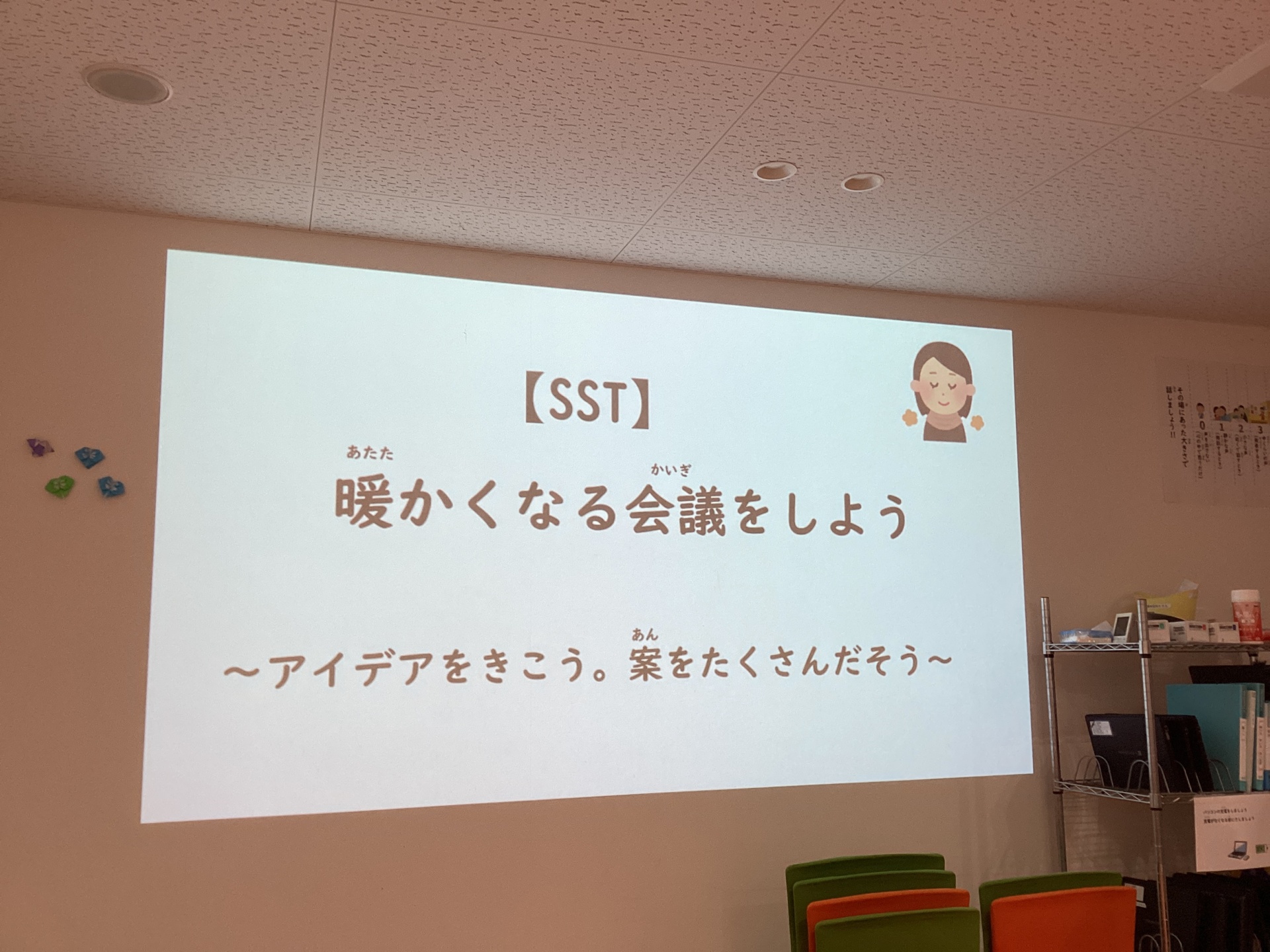 今回のSSTでは考えをまとめる手前の「考えをたくさん出し合い、温かい雰囲気で受け止める」ことを行いました。