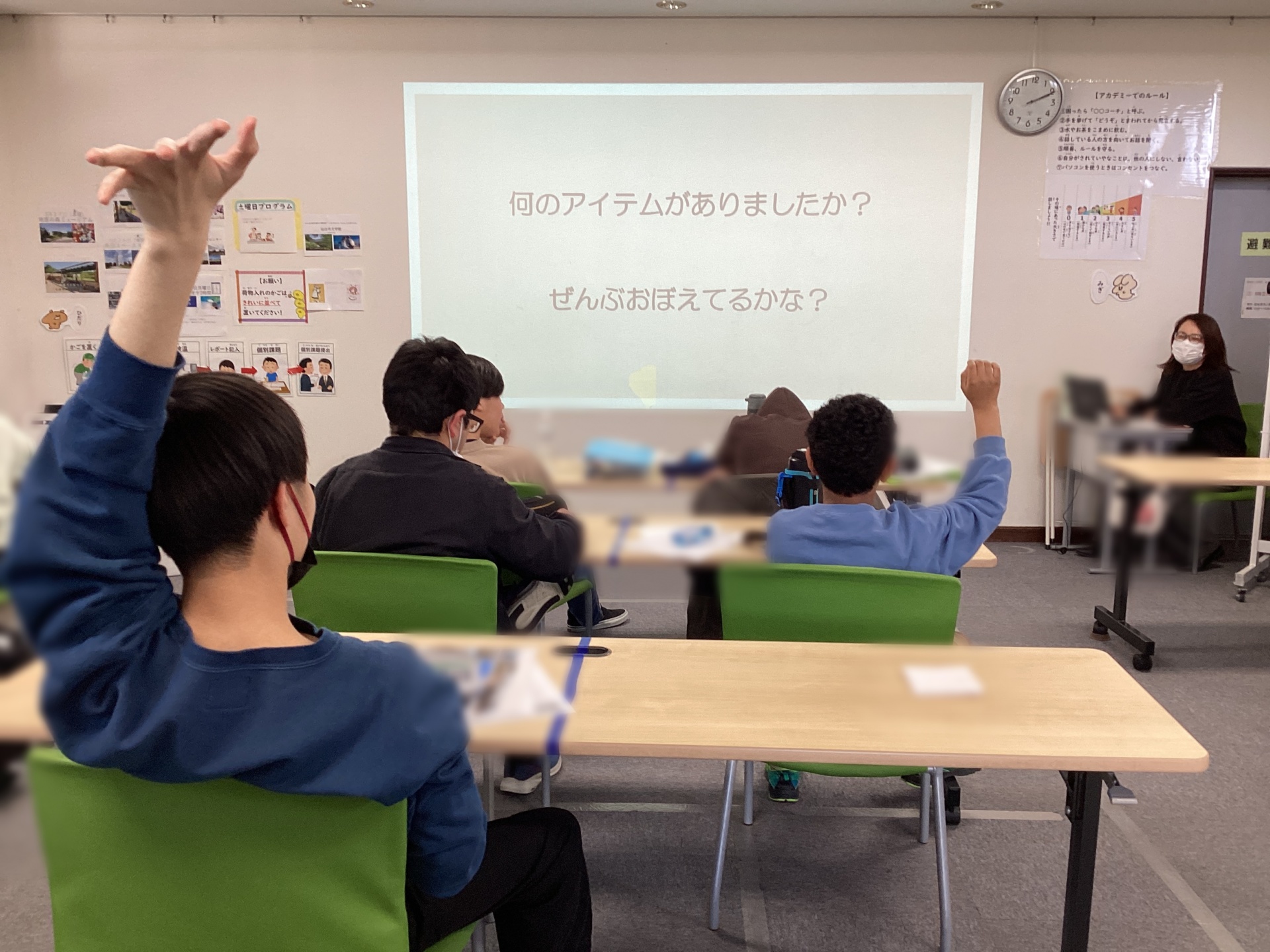 くだもの・やさい・アイテム・数字等の画像を見ていくつ記憶できるかに挑戦すると「当たった!」「全問正解しました!」と皆で楽しく賑やかに取り組みました。