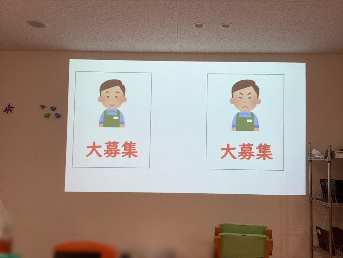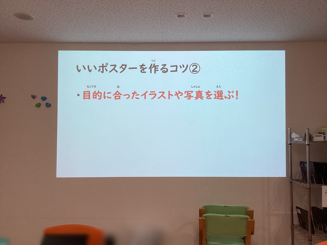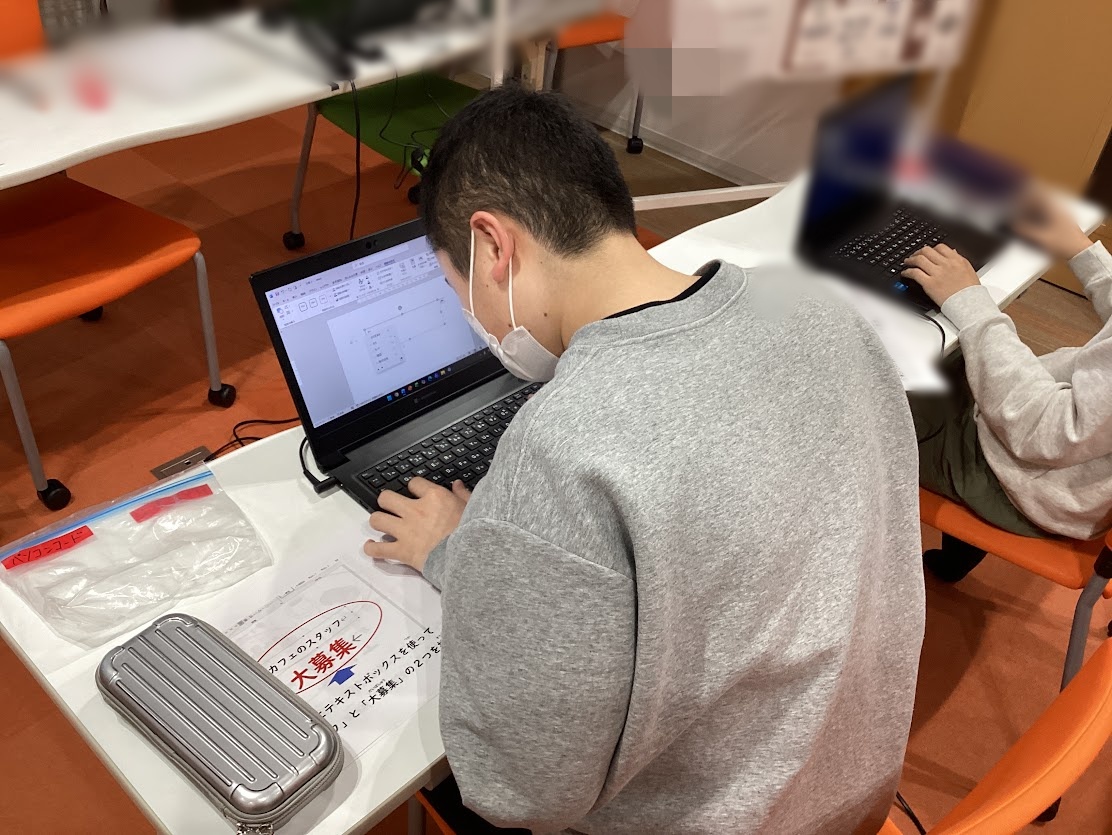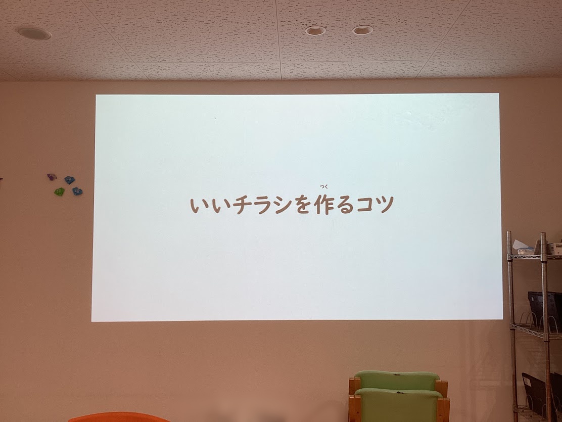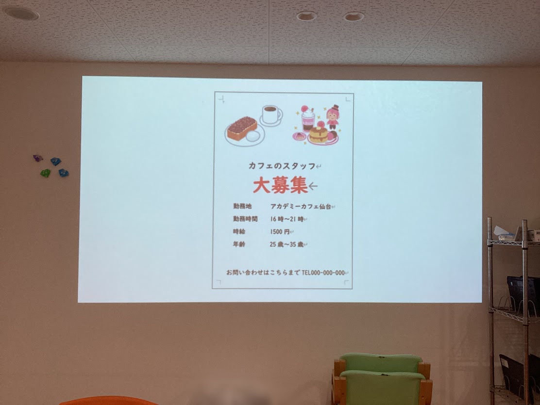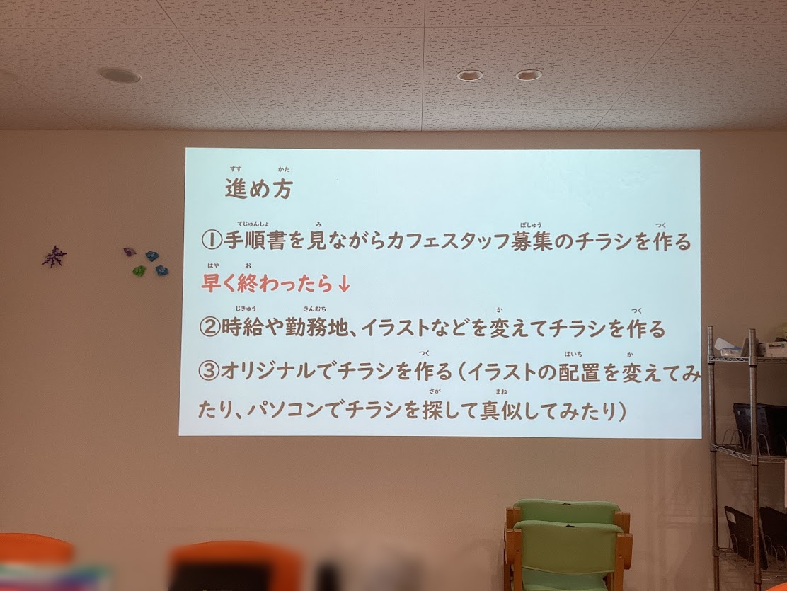 チラシ作りのコツについてお話を聞いた後に、カフェスタッフ募集のチラシを手順書を見ながら作る活動を行いました。