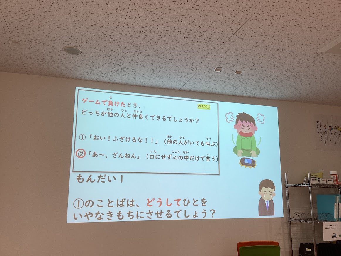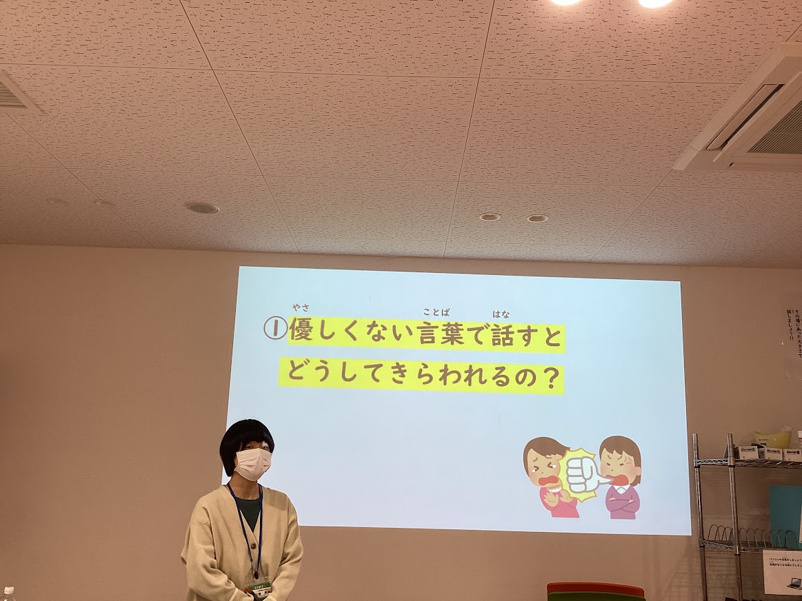 優しい言葉を使わないとどうして嫌われてしまうのかなどを学びました。