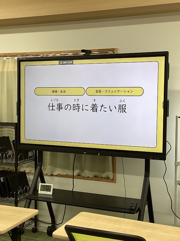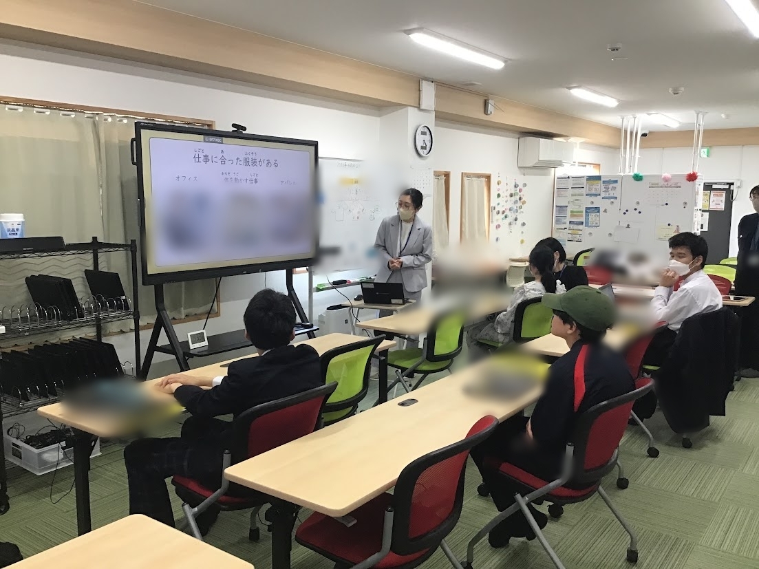 仕事の時に着る服にはどんなものがあるか、なぜその場に合わせた服を着ることが大切なのかを学んでいただきました。