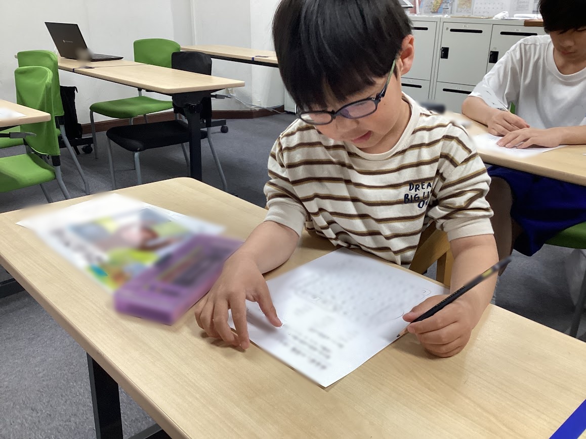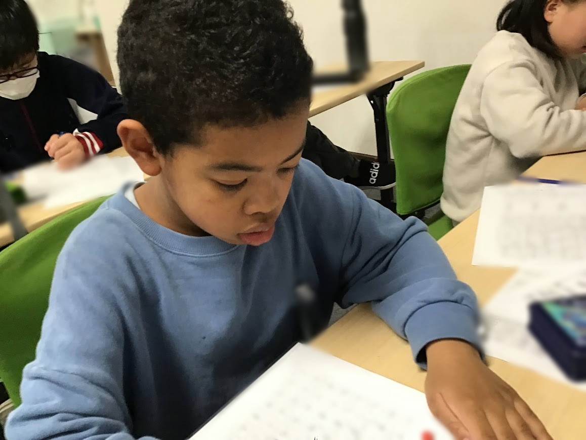 マス表の中から文字を探し、指定された言葉を見つける内容で、視覚的に情報を捉えながら集中して探す力や、